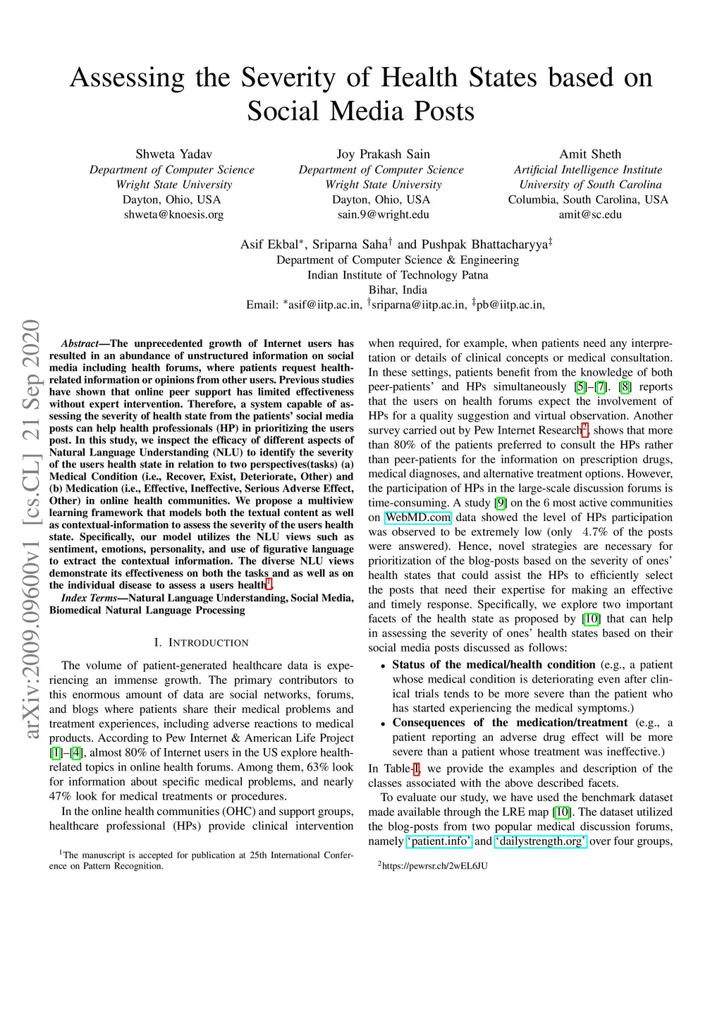 The unprecedented growth of Internet users has resulted in an abundance of unstructured information on social media including health forums, where patients request health-related information or opinions from other users. Previous studies have shown that online peer support has limited effectiveness without expert intervention. Therefore, a system capable of assessing the severity of health state from the patients' social media posts can help health professionals (HP) in prioritizing the user's post. In this study, we inspect the efficacy of different aspects of Natural Language Understanding (NLU) to identify the severity of the user's health state in relation to two perspectives(tasks) (a) Medical Condition (i.e., Recover, Exist, Deteriorate, Other) and (b) Medication (i.e., Effective, Ineffective, Serious Adverse Effect, Other) in online health communities. We propose a multiview learning framework that models both the textual content as well as contextual-information to assess the severity of the user's health state. Specifically, our model utilizes the NLU views such as sentiment, emotions, personality, and use of figurative language to extract the contextual information. The diverse NLU views demonstrate its effectiveness on both the tasks and as well as on the individual disease to assess a user's health.