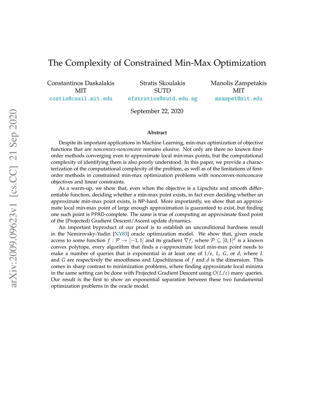 Despite its important applications in Machine Learning, min-max optimization of nonconvex-nonconcave objectives remains elusive. Not only are there no known first-order methods converging even to approximate local min-max points, but the computational complexity of identifying them is also poorly understood. In this paper, we provide a characterization of the computational complexity of the problem, as well as of the limitations of first-order methods in constrained min-max optimization problems with nonconvex-nonconcave objectives and linear constraints. As a warm-up, we show that, even when the objective is a Lipschitz and smooth differentiable function, deciding whether a min-max point exists, in fact even deciding whether an approximate min-max point exists, is NP-hard. More importantly, we show that an approximate local min-max point of large enough approximation is guaranteed to exist, but finding one such point is PPAD-complete. The same is true of computing an approximate fixed point of Gradient Descent/Ascent. An important byproduct of our proof is to establish an unconditional hardness result in the Nemirovsky-Yudin model. We show that, given oracle access to some function and its gradient , where is a known convex polytope, every algorithm that finds a -approximate local min-max point needs to make a number of queries that is exponential in at least one of , , , or , where and are respectively the smoothness and Lipschitzness of and is the dimension. This comes in sharp contrast to minimization problems, where finding approximate local minima in the same setting can be done with Projected Gradient Descent using many queries. Our result is the first to show an exponential separation between these two fundamental optimization problems.
