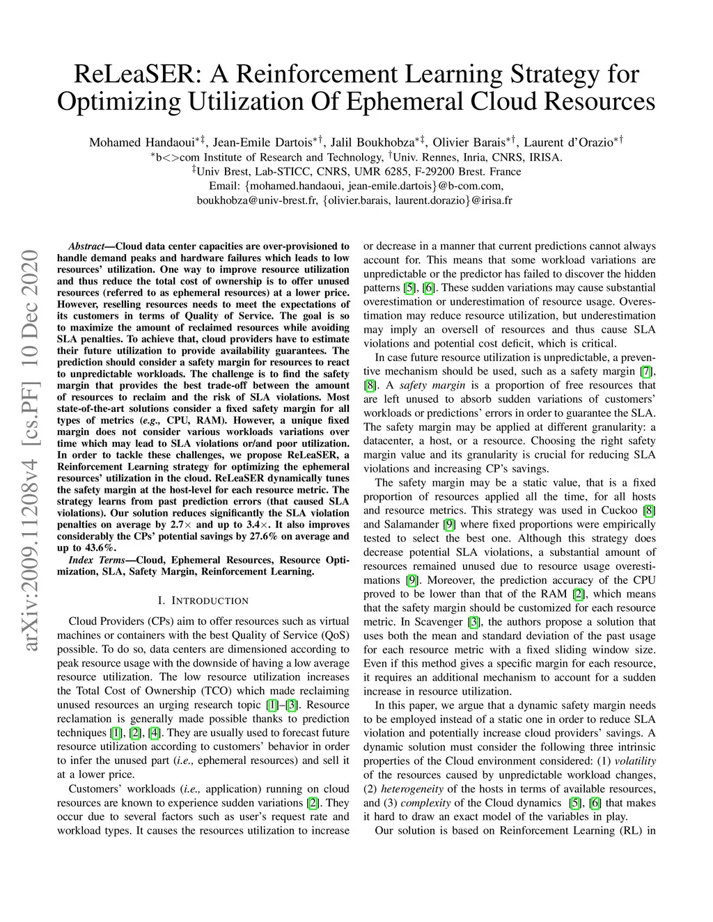 Cloud data center capacities are over-provisioned to handle demand peaks and hardware failures which leads to low resources' utilization. One way to improve resource utilization and thus reduce the total cost of ownership is to offer unused resources (referred to as ephemeral resources) at a lower price. However, reselling resources needs to meet the expectations of its customers in terms of Quality of Service. The goal is so to maximize the amount of reclaimed resources while avoiding SLA penalties. To achieve that, cloud providers have to estimate their future utilization to provide availability guarantees. The prediction should consider a safety margin for resources to react to unpredictable workloads. The challenge is to find the safety margin that provides the best trade-off between the amount of resources to reclaim and the risk of SLA violations. Most state-of-the-art solutions consider a fixed safety margin for all types of metrics (e.g., CPU, RAM). However, a unique fixed margin does not consider various workloads variations over time which may lead to SLA violations or/and poor utilization. In order to tackle these challenges, we propose ReLeaSER, a Reinforcement Learning strategy for optimizing the ephemeral resources' utilization in the cloud. ReLeaSER dynamically tunes the safety margin at the host-level for each resource metric. The strategy learns from past prediction errors (that caused SLA violations). Our solution reduces significantly the SLA violation penalties on average by 2.7x and up to 3.4x. It also improves considerably the CPs' potential savings by 27.6% on average and up to 43.6%.