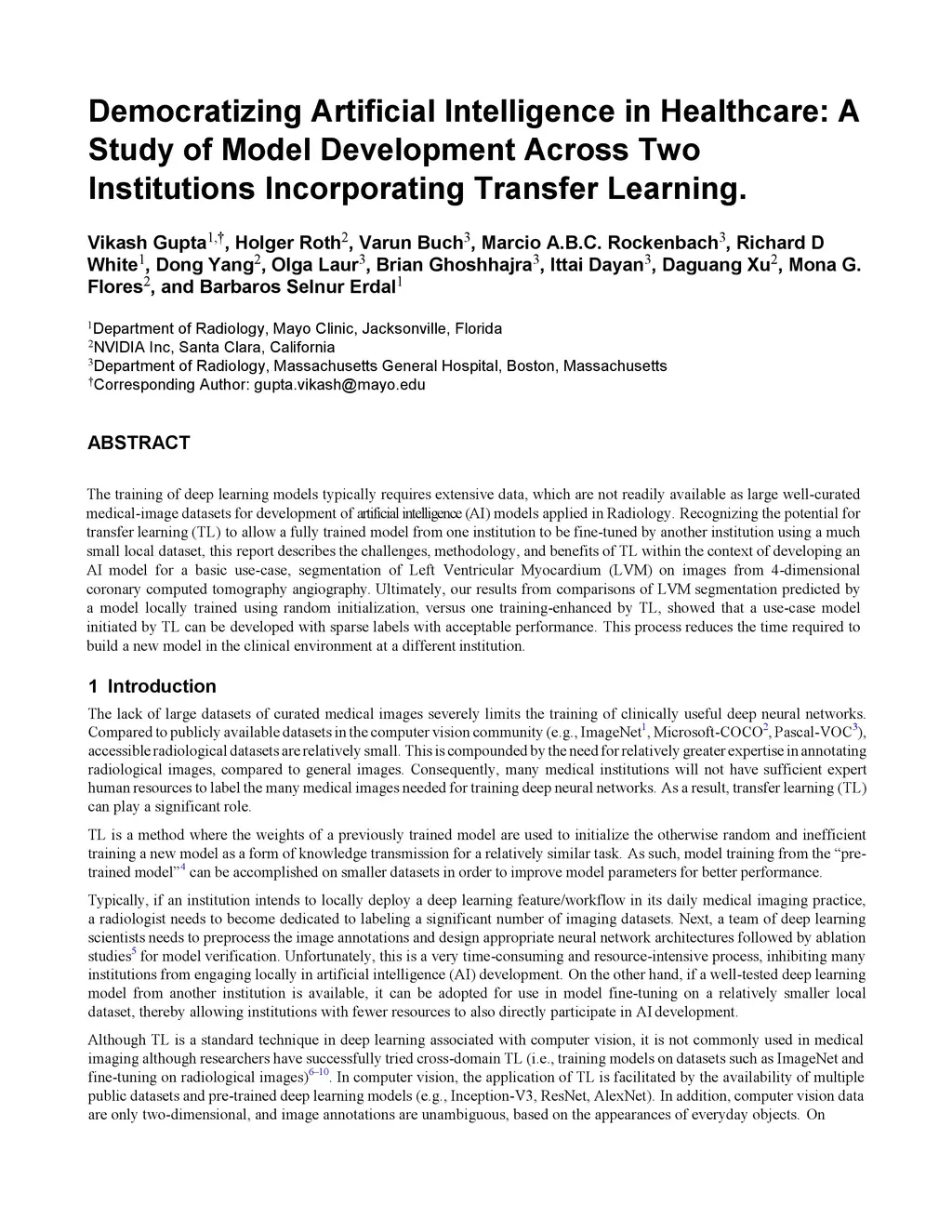 The training of deep learning models typically requires extensive data, which are not readily available as large well-curated medical-image datasets for development of artificial intelligence (AI) models applied in Radiology. Recognizing the potential for transfer learning (TL) to allow a fully trained model from one institution to be fine-tuned by another institution using a much small local dataset, this report describes the challenges, methodology, and benefits of TL within the context of developing an AI model for a basic use-case, segmentation of Left Ventricular Myocardium (LVM) on images from 4-dimensional coronary computed tomography angiography. Ultimately, our results from comparisons of LVM segmentation predicted by a model locally trained using random initialization, versus one training-enhanced by TL, showed that a use-case model initiated by TL can be developed with sparse labels with acceptable performance. This process reduces the time required to build a new model in the clinical environment at a different institution.