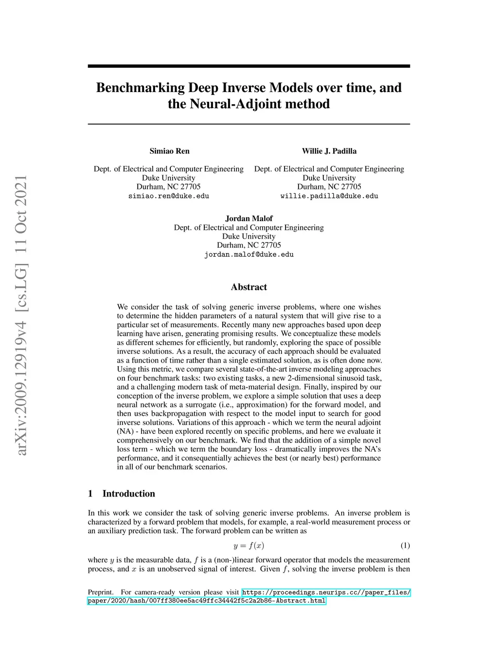 We consider the task of solving generic inverse problems, where one wishes to determine the hidden parameters of a natural system that will give rise to a particular set of measurements. Recently many new approaches based upon deep learning have arisen generating impressive results. We conceptualize these models as different schemes for efficiently, but randomly, exploring the space of possible inverse solutions. As a result, the accuracy of each approach should be evaluated as a function of time rather than a single estimated solution, as is often done now. Using this metric, we compare several state-of-the-art inverse modeling approaches on four benchmark tasks: two existing tasks, one simple task for visualization and one new task from metamaterial design. Finally, inspired by our conception of the inverse problem, we explore a solution that uses a deep learning model to approximate the forward model, and then uses backpropagation to search for good inverse solutions. This approach, termed the neural-adjoint, achieves the best performance in many scenarios.