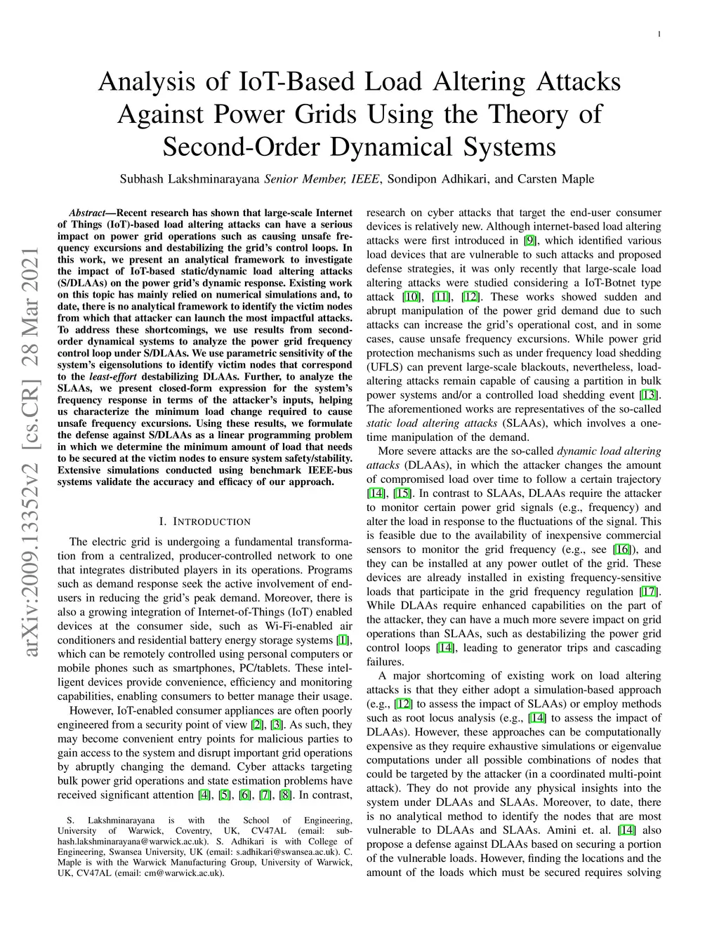Recent research has shown that large-scale Internet of Things (IoT)-based load altering attacks can have a serious impact on power grid operations such as causing unsafe frequency excursions and destabilizing the grid's control loops. In this work, we present an analytical framework to investigate the impact of IoT-based static/dynamic load altering attacks (S/DLAAs) on the power grid's dynamic response. Existing work on this topic has mainly relied on numerical simulations and, to date, there is no analytical framework to identify the victim nodes from which that attacker can launch the most impactful attacks. To address these shortcomings, we use results from second-order dynamical systems to analyze the power grid frequency control loop under S/DLAAs. We use parametric sensitivity of the system's eigensolutions to identify victim nodes that correspond to the least-effort destabilizing DLAAs. Further, to analyze the SLAAs, we present closed-form expression for the system's frequency response in terms of the attacker's inputs, helping us characterize the minimum load change required to cause unsafe frequency excursions. Using these results, we formulate the defense against S/DLAAs as a linear programming problem in which we determine the minimum amount of load that needs to be secured at the victim nodes to ensure system safety/stability. Extensive simulations conducted using benchmark IEEE-bus systems validate the accuracy and efficacy of our approach.