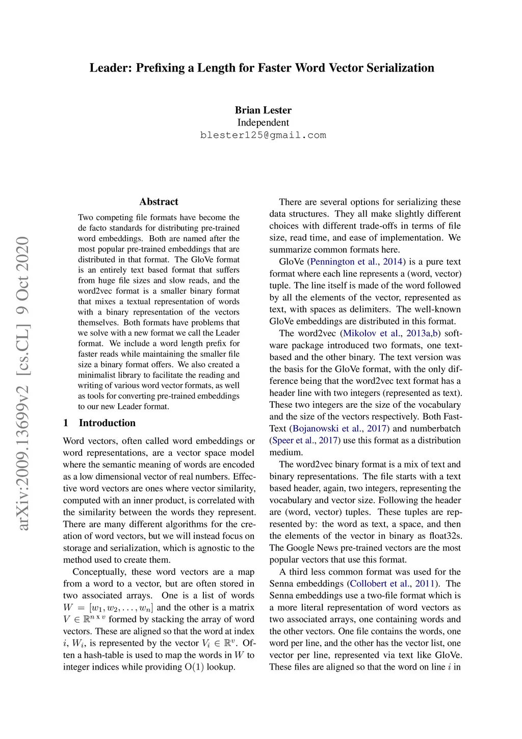 Two competing file formats have become the de facto standards for distributing pre-trained word embeddings. Both are named after the most popular pre-trained embeddings that are distributed in that format. The GloVe format is an entirely text based format that suffers from huge file sizes and slow reads, and the word2vec format is a smaller binary format that mixes a textual representation of words with a binary representation of the vectors themselves. Both formats have problems that we solve with a new format we call the Leader format. We include a word length prefix for faster reads while maintaining the smaller file size a binary format offers. We also created a minimalist library to facilitate the reading and writing of various word vector formats, as well as tools for converting pre-trained embeddings to our new Leader format.