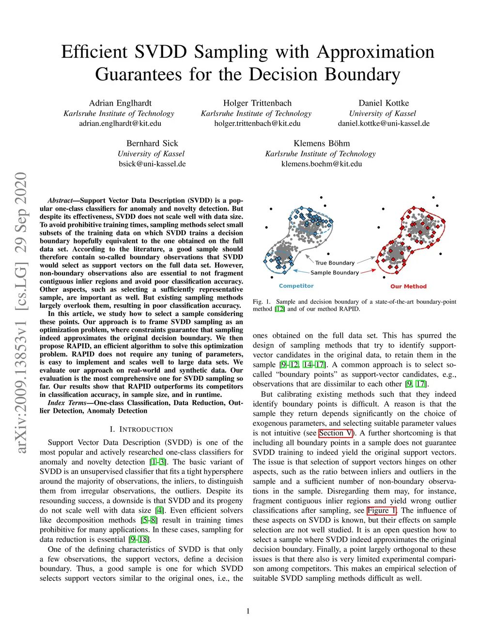 Support Vector Data Description (SVDD) is a popular one-class classifiers for anomaly and novelty detection. But despite its effectiveness, SVDD does not scale well with data size. To avoid prohibitive training times, sampling methods select small subsets of the training data on which SVDD trains a decision boundary hopefully equivalent to the one obtained on the full data set. According to the literature, a good sample should therefore contain so-called boundary observations that SVDD would select as support vectors on the full data set. However, non-boundary observations also are essential to not fragment contiguous inlier regions and avoid poor classification accuracy. Other aspects, such as selecting a sufficiently representative sample, are important as well. But existing sampling methods largely overlook them, resulting in poor classification accuracy. In this article, we study how to select a sample considering these points. Our approach is to frame SVDD sampling as an optimization problem, where constraints guarantee that sampling indeed approximates the original decision boundary. We then propose RAPID, an efficient algorithm to solve this optimization problem. RAPID does not require any tuning of parameters, is easy to implement and scales well to large data sets. We evaluate our approach on real-world and synthetic data. Our evaluation is the most comprehensive one for SVDD sampling so far. Our results show that RAPID outperforms its competitors in classification accuracy, in sample size, and in runtime.