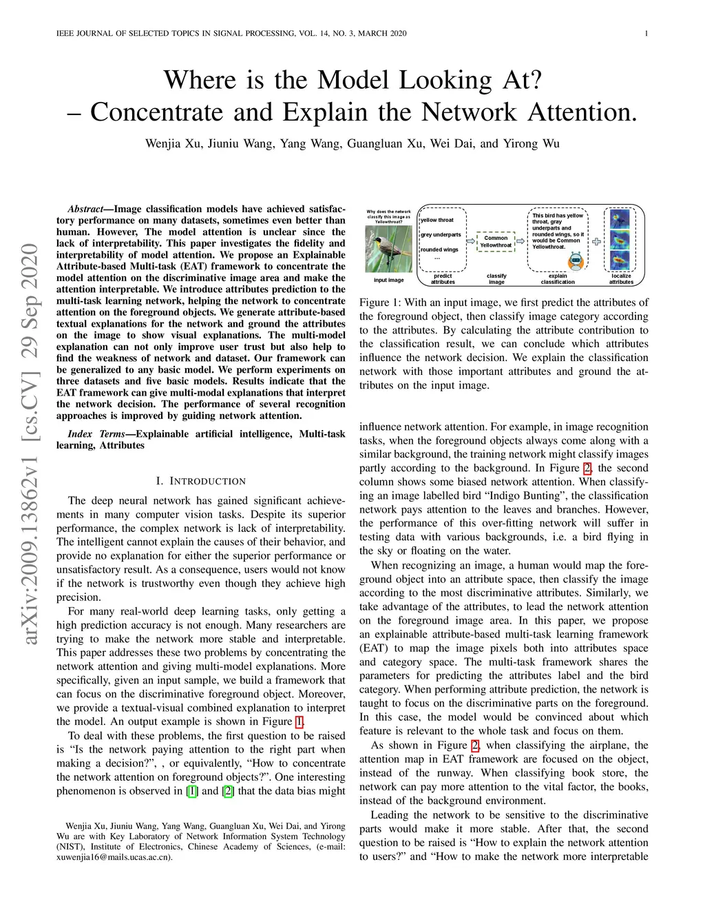 Image classification models have achieved satisfactory performance on many datasets, sometimes even better than human. However, The model attention is unclear since the lack of interpretability. This paper investigates the fidelity and interpretability of model attention. We propose an Explainable Attribute-based Multi-task (EAT) framework to concentrate the model attention on the discriminative image area and make the attention interpretable. We introduce attributes prediction to the multi-task learning network, helping the network to concentrate attention on the foreground objects. We generate attribute-based textual explanations for the network and ground the attributes on the image to show visual explanations. The multi-model explanation can not only improve user trust but also help to find the weakness of network and dataset. Our framework can be generalized to any basic model. We perform experiments on three datasets and five basic models. Results indicate that the EAT framework can give multi-modal explanations that interpret the network decision. The performance of several recognition approaches is improved by guiding network attention.