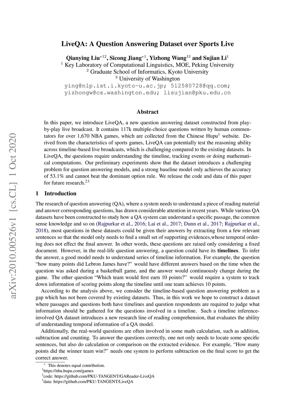 In this paper, we introduce LiveQA, a new question answering dataset constructed from play-by-play live broadcast. It contains 117k multiple-choice questions written by human commentators for over 1,670 NBA games, which are collected from the Chinese Hupu (https://nba.hupu.com/games) website. Derived from the characteristics of sports games, LiveQA can potentially test the reasoning ability across timeline-based live broadcasts, which is challenging compared to the existing datasets. In LiveQA, the questions require understanding the timeline, tracking events or doing mathematical computations. Our preliminary experiments show that the dataset introduces a challenging problem for question answering models, and a strong baseline model only achieves the accuracy of 53.1\% and cannot beat the dominant option rule. We release the code and data of this paper for future research.
