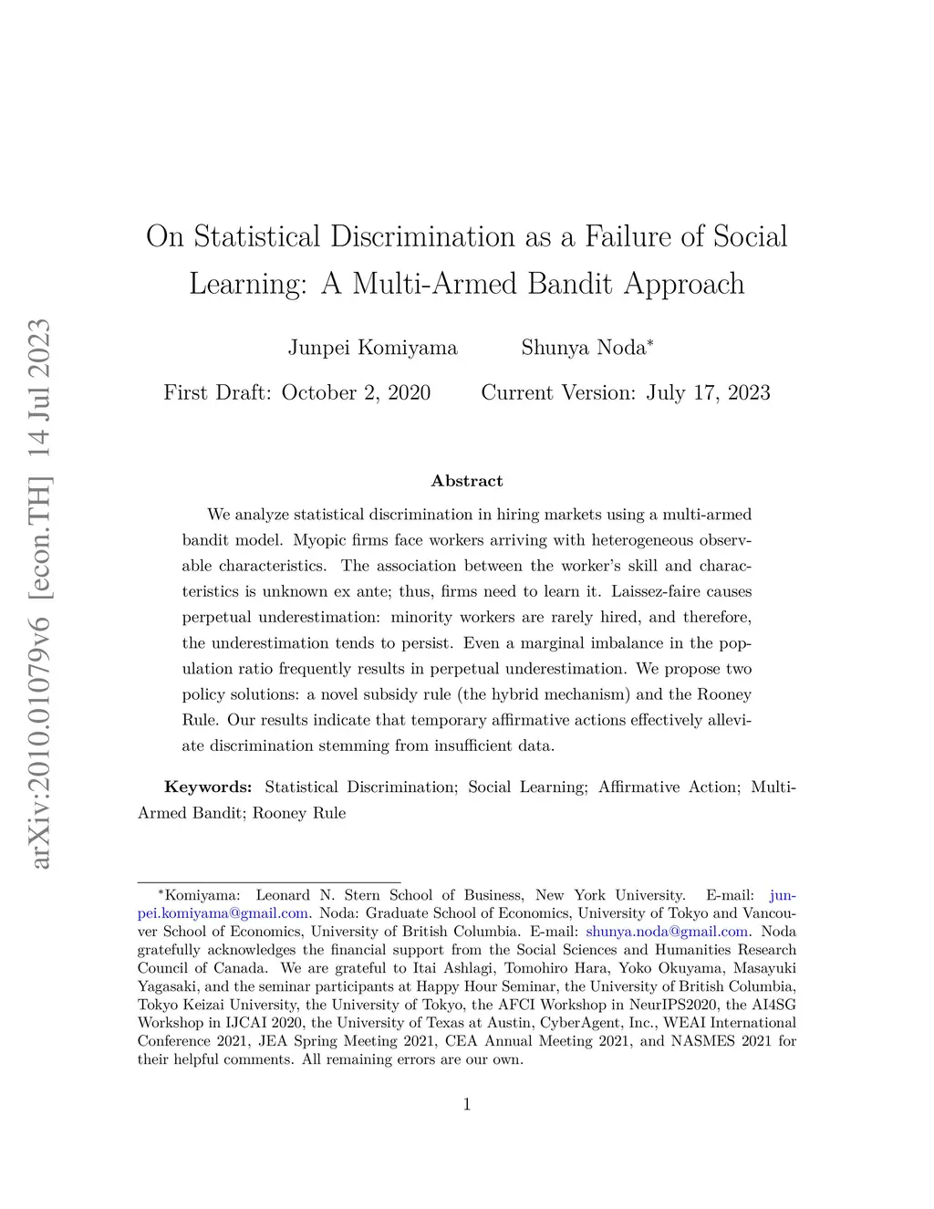 We analyze statistical discrimination in hiring markets using a multi-armed bandit model. Myopic firms face workers arriving with heterogeneous observable characteristics. The association between the worker's skill and characteristics is unknown ex ante; thus, firms need to learn it. Laissez-faire causes perpetual underestimation: minority workers are rarely hired, and therefore, the underestimation tends to persist. Even a marginal imbalance in the population ratio frequently results in perpetual underestimation. We propose two policy solutions: a novel subsidy rule (the hybrid mechanism) and the Rooney Rule. Our results indicate that temporary affirmative actions effectively alleviate discrimination stemming from insufficient data.