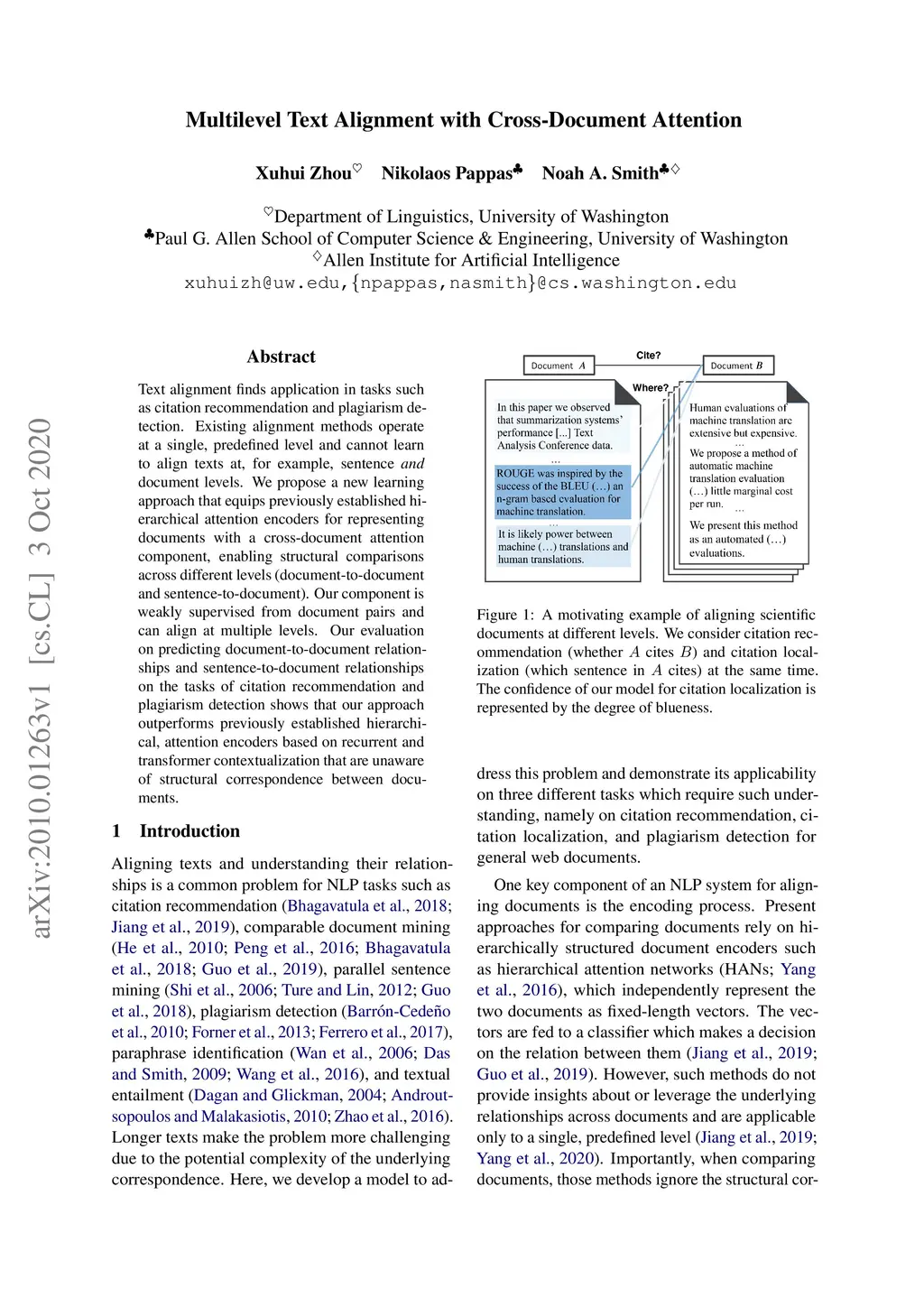 Text alignment finds application in tasks such as citation recommendation and plagiarism detection. Existing alignment methods operate at a single, predefined level and cannot learn to align texts at, for example, sentence and document levels. We propose a new learning approach that equips previously established hierarchical attention encoders for representing documents with a cross-document attention component, enabling structural comparisons across different levels (document-to-document and sentence-to-document). Our component is weakly supervised from document pairs and can align at multiple levels. Our evaluation on predicting document-to-document relationships and sentence-to-document relationships on the tasks of citation recommendation and plagiarism detection shows that our approach outperforms previously established hierarchical, attention encoders based on recurrent and transformer contextualization that are unaware of structural correspondence between documents.