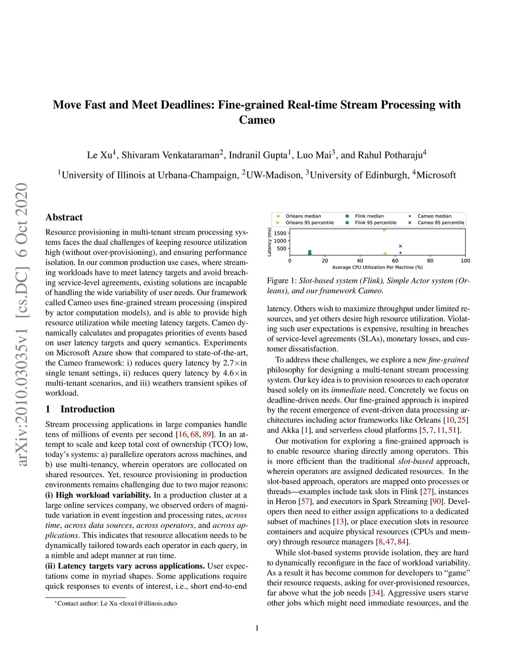 Resource provisioning in multi-tenant stream processing systems faces the dual challenges of keeping resource utilization high (without over-provisioning), and ensuring performance isolation. In our common production use cases, where streaming workloads have to meet latency targets and avoid breaching service-level agreements, existing solutions are incapable of handling the wide variability of user needs. Our framework called Cameo uses fine-grained stream processing (inspired by actor computation models), and is able to provide high resource utilization while meeting latency targets. Cameo dynamically calculates and propagates priorities of events based on user latency targets and query semantics. Experiments on Microsoft Azure show that compared to state-of-the-art, the Cameo framework: i) reduces query latency by 2.7X in single tenant settings, ii) reduces query latency by 4.6X in multi-tenant scenarios, and iii) weathers transient spikes of workload.