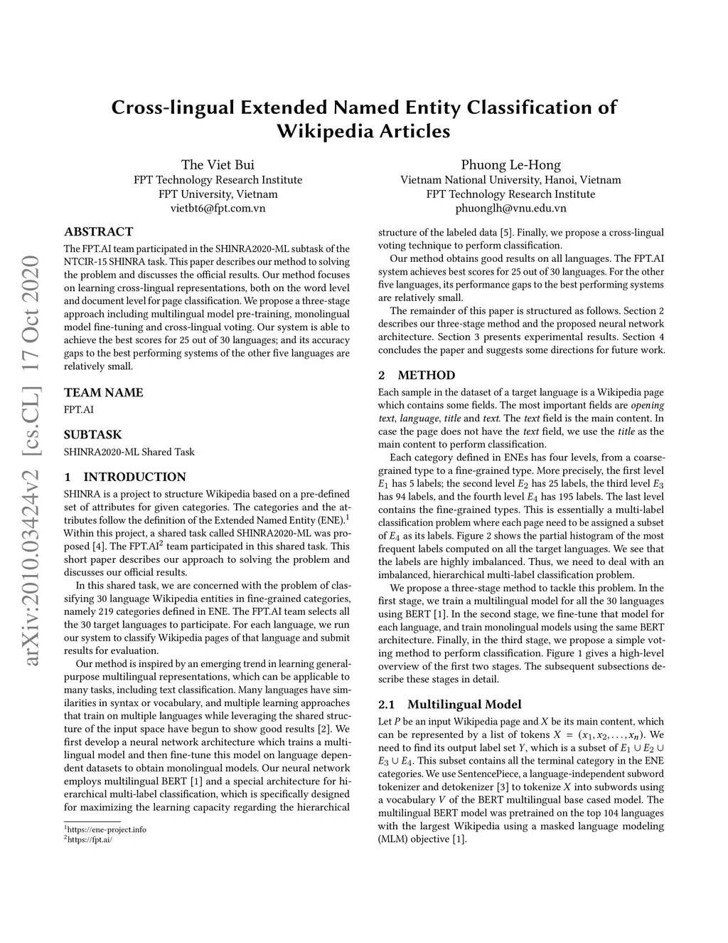 The FPT.AI team participated in the SHINRA2020-ML subtask of the NTCIR-15 SHINRA task. This paper describes our method to solving the problem and discusses the official results. Our method focuses on learning cross-lingual representations, both on the word level and document level for page classification. We propose a three-stage approach including multilingual model pre-training, monolingual model fine-tuning and cross-lingual voting. Our system is able to achieve the best scores for 25 out of 30 languages; and its accuracy gaps to the best performing systems of the other five languages are relatively small.