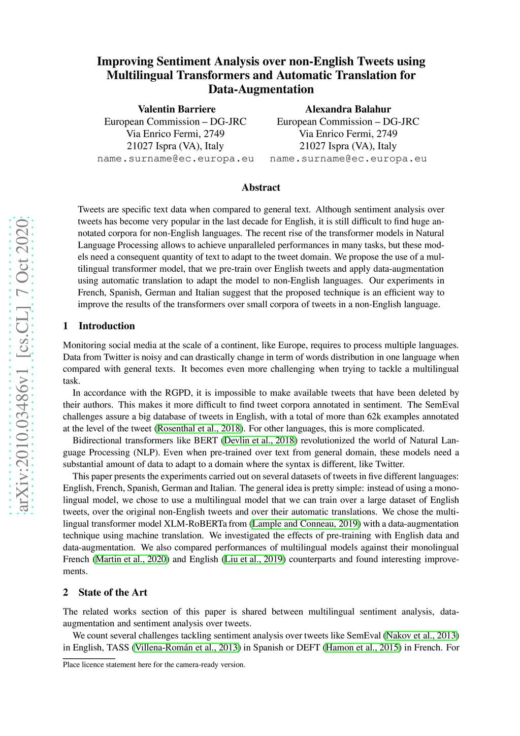 Tweets are specific text data when compared to general text. Although sentiment analysis over tweets has become very popular in the last decade for English, it is still difficult to find huge annotated corpora for non-English languages. The recent rise of the transformer models in Natural Language Processing allows to achieve unparalleled performances in many tasks, but these models need a consequent quantity of text to adapt to the tweet domain. We propose the use of a multilingual transformer model, that we pre-train over English tweets and apply data-augmentation using automatic translation to adapt the model to non-English languages. Our experiments in French, Spanish, German and Italian suggest that the proposed technique is an efficient way to improve the results of the transformers over small corpora of tweets in a non-English language.