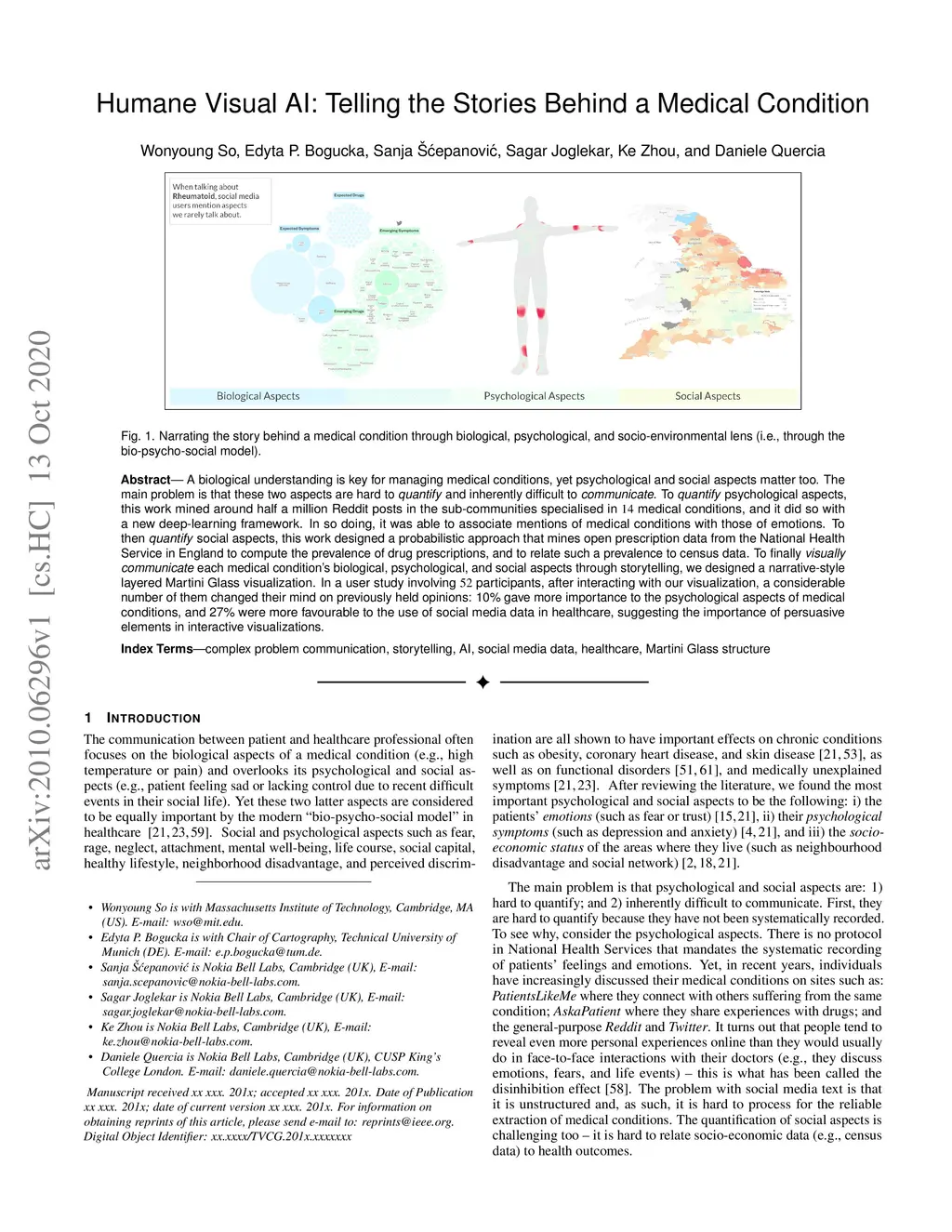 A biological understanding is key for managing medical conditions, yet psychological and social aspects matter too. The main problem is that these two aspects are hard to quantify and inherently difficult to communicate. To quantify psychological aspects, this work mined around half a million Reddit posts in the sub-communities specialised in 14 medical conditions, and it did so with a new deep-learning framework. In so doing, it was able to associate mentions of medical conditions with those of emotions. To then quantify social aspects, this work designed a probabilistic approach that mines open prescription data from the National Health Service in England to compute the prevalence of drug prescriptions, and to relate such a prevalence to census data. To finally visually communicate each medical condition's biological, psychological, and social aspects through storytelling, we designed a narrative-style layered Martini Glass visualization. In a user study involving 52 participants, after interacting with our visualization, a considerable number of them changed their mind on previously held opinions: 10% gave more importance to the psychological aspects of medical conditions, and 27% were more favourable to the use of social media data in healthcare, suggesting the importance of persuasive elements in interactive visualizations.