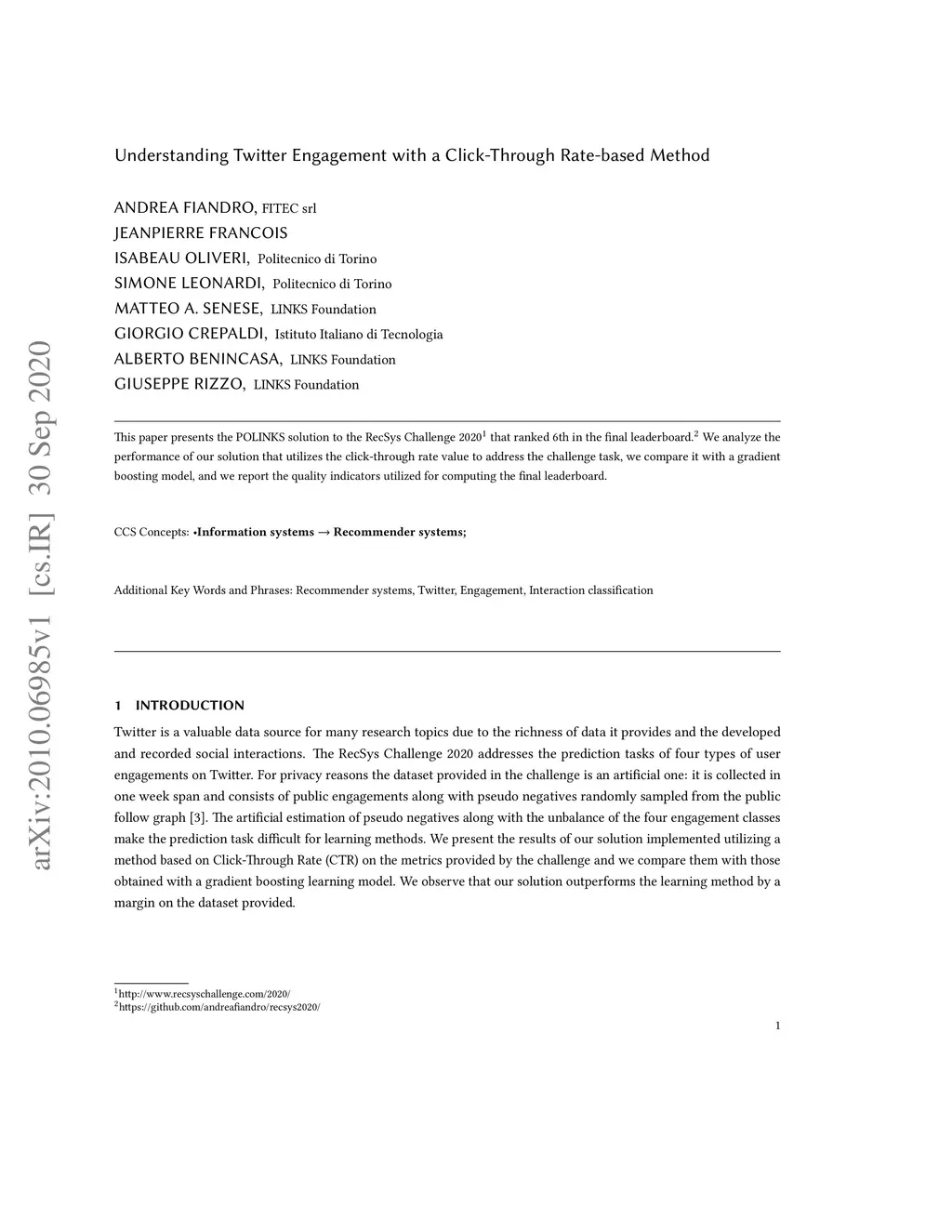 This paper presents the POLINKS solution to the RecSys Challenge 2020 that ranked 6th in the final leaderboard. We analyze the performance of our solution that utilizes the click-through rate value to address the challenge task, we compare it with a gradient boosting model, and we report the quality indicators utilized for computing the final leaderboard.