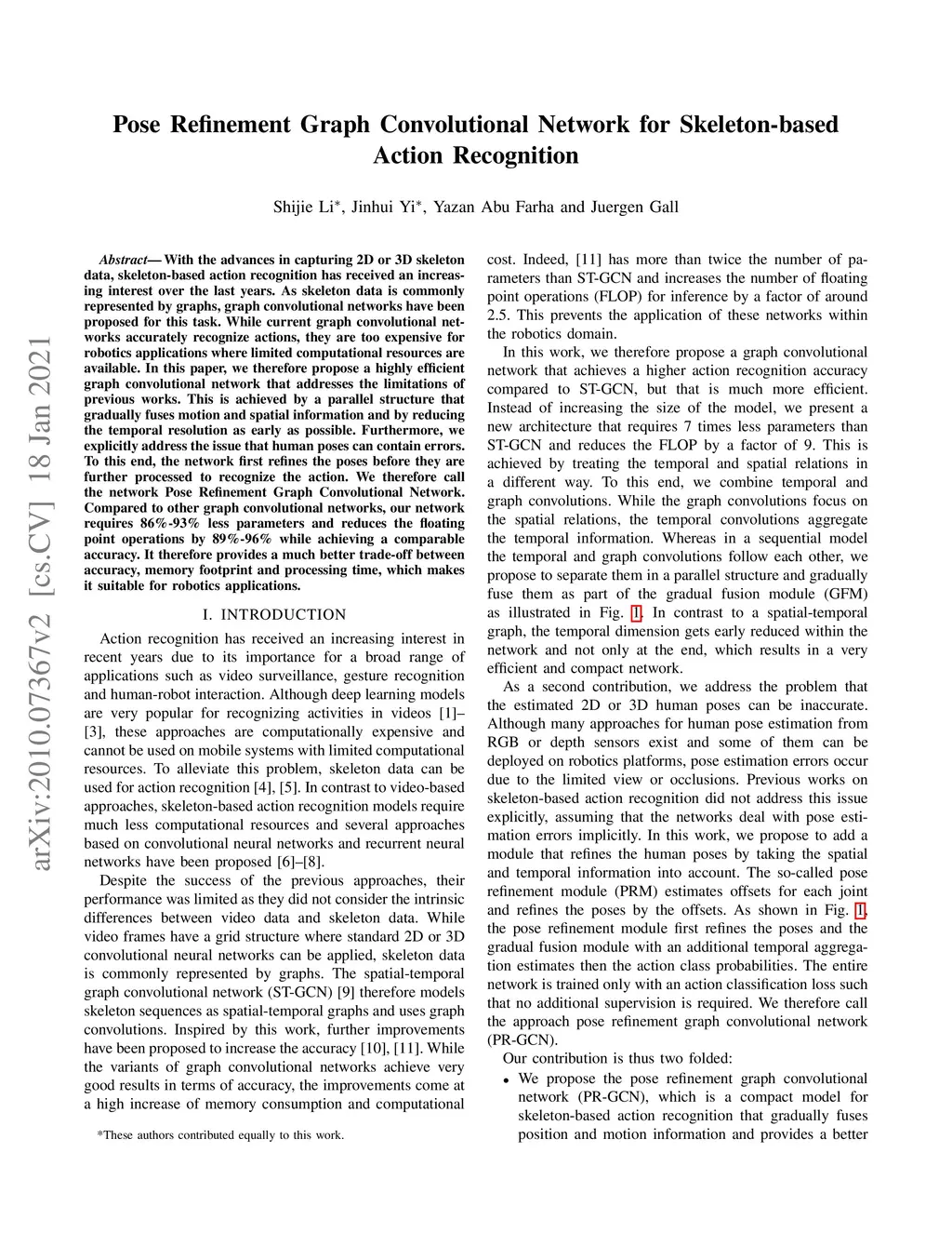 With the advances in capturing 2D or 3D skeleton data, skeleton-based action recognition has received an increasing interest over the last years. As skeleton data is commonly represented by graphs, graph convolutional networks have been proposed for this task. While current graph convolutional networks accurately recognize actions, they are too expensive for robotics applications where limited computational resources are available. In this paper, we therefore propose a highly efficient graph convolutional network that addresses the limitations of previous works. This is achieved by a parallel structure that gradually fuses motion and spatial information and by reducing the temporal resolution as early as possible. Furthermore, we explicitly address the issue that human poses can contain errors. To this end, the network first refines the poses before they are further processed to recognize the action. We therefore call the network Pose Refinement Graph Convolutional Network. Compared to other graph convolutional networks, our network requires 86\%-93\% less parameters and reduces the floating point operations by 89%-96% while achieving a comparable accuracy. It therefore provides a much better trade-off between accuracy, memory footprint and processing time, which makes it suitable for robotics applications.