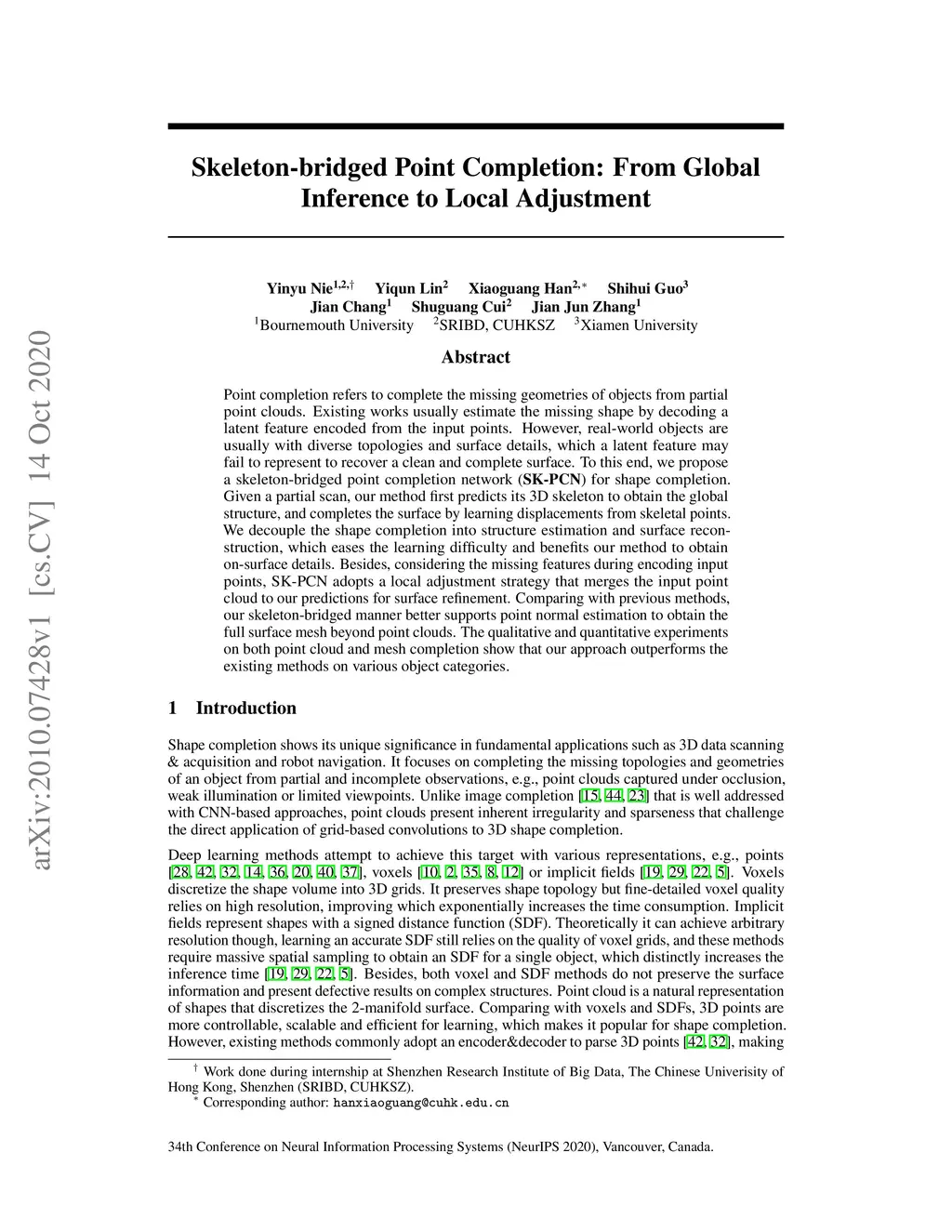 Point completion refers to complete the missing geometries of objects from partial point clouds. Existing works usually estimate the missing shape by decoding a latent feature encoded from the input points. However, real-world objects are usually with diverse topologies and surface details, which a latent feature may fail to represent to recover a clean and complete surface. To this end, we propose a skeleton-bridged point completion network (SK-PCN) for shape completion. Given a partial scan, our method first predicts its 3D skeleton to obtain the global structure, and completes the surface by learning displacements from skeletal points. We decouple the shape completion into structure estimation and surface reconstruction, which eases the learning difficulty and benefits our method to obtain on-surface details. Besides, considering the missing features during encoding input points, SK-PCN adopts a local adjustment strategy that merges the input point cloud to our predictions for surface refinement. Comparing with previous methods, our skeleton-bridged manner better supports point normal estimation to obtain the full surface mesh beyond point clouds. The qualitative and quantitative experiments on both point cloud and mesh completion show that our approach outperforms the existing methods on various object categories.