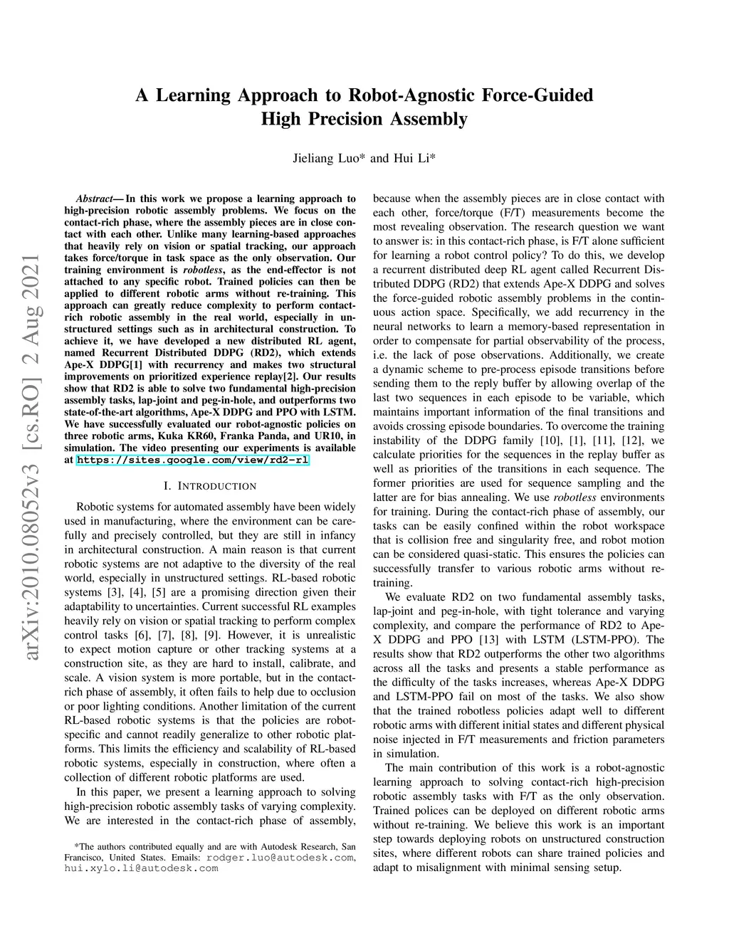 In this work we propose a learning approach to high-precision robotic assembly problems. We focus on the contact-rich phase, where the assembly pieces are in close contact with each other. Unlike many learning-based approaches that heavily rely on vision or spatial tracking, our approach takes force/torque in task space as the only observation. Our training environment is robotless, as the end-effector is not attached to any specific robot. Trained policies can then be applied to different robotic arms without re-training. This approach can greatly reduce complexity to perform contact-rich robotic assembly in the real world, especially in unstructured settings such as in architectural construction. To achieve it, we have developed a new distributed RL agent, named Recurrent Distributed DDPG (RD2), which extends Ape-X DDPG with recurrency and makes two structural improvements on prioritized experience replay. Our results show that RD2 is able to solve two fundamental high-precision assembly tasks, lap-joint and peg-in-hole, and outperforms two state-of-the-art algorithms, Ape-X DDPG and PPO with LSTM. We have successfully evaluated our robot-agnostic policies on three robotic arms, Kuka KR60, Franka Panda, and UR10, in simulation. The video presenting our experiments is available at https://sites.google.com/view/rd2-rl