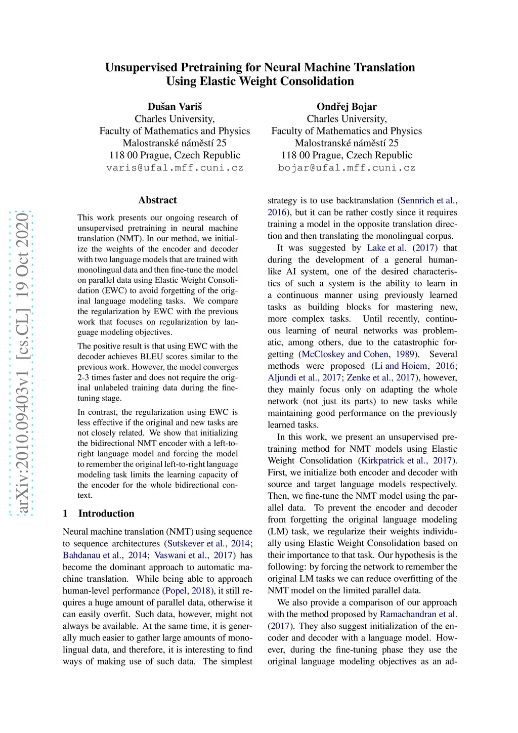 This work presents our ongoing research of unsupervised pretraining in neural machine translation (NMT). In our method, we initialize the weights of the encoder and decoder with two language models that are trained with monolingual data and then fine-tune the model on parallel data using Elastic Weight Consolidation (EWC) to avoid forgetting of the original language modeling tasks. We compare the regularization by EWC with the previous work that focuses on regularization by language modeling objectives. The positive result is that using EWC with the decoder achieves BLEU scores similar to the previous work. However, the model converges 2-3 times faster and does not require the original unlabeled training data during the fine-tuning stage. In contrast, the regularization using EWC is less effective if the original and new tasks are not closely related. We show that initializing the bidirectional NMT encoder with a left-to-right language model and forcing the model to remember the original left-to-right language modeling task limits the learning capacity of the encoder for the whole bidirectional context.