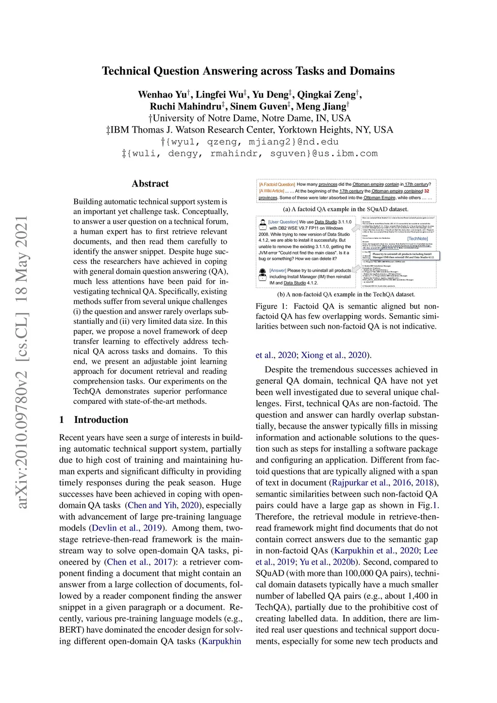 Building automatic technical support system is an important yet challenge task. Conceptually, to answer a user question on a technical forum, a human expert has to first retrieve relevant documents, and then read them carefully to identify the answer snippet. Despite huge success the researchers have achieved in coping with general domain question answering (QA), much less attentions have been paid for investigating technical QA. Specifically, existing methods suffer from several unique challenges (i) the question and answer rarely overlaps substantially and (ii) very limited data size. In this paper, we propose a novel framework of deep transfer learning to effectively address technical QA across tasks and domains. To this end, we present an adjustable joint learning approach for document retrieval and reading comprehension tasks. Our experiments on the TechQA demonstrates superior performance compared with state-of-the-art methods.