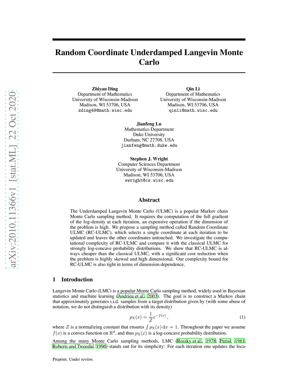 The Underdamped Langevin Monte Carlo (ULMC) is a popular Markov chain Monte Carlo sampling method. It requires the computation of the full gradient of the log-density at each iteration, an expensive operation if the dimension of the problem is high. We propose a sampling method called Random Coordinate ULMC (RC-ULMC), which selects a single coordinate at each iteration to be updated and leaves the other coordinates untouched. We investigate the computational complexity of RC-ULMC and compare it with the classical ULMC for strongly log-concave probability distributions. We show that RC-ULMC is always cheaper than the classical ULMC, with a significant cost reduction when the problem is highly skewed and high dimensional. Our complexity bound for RC-ULMC is also tight in terms of dimension dependence.
