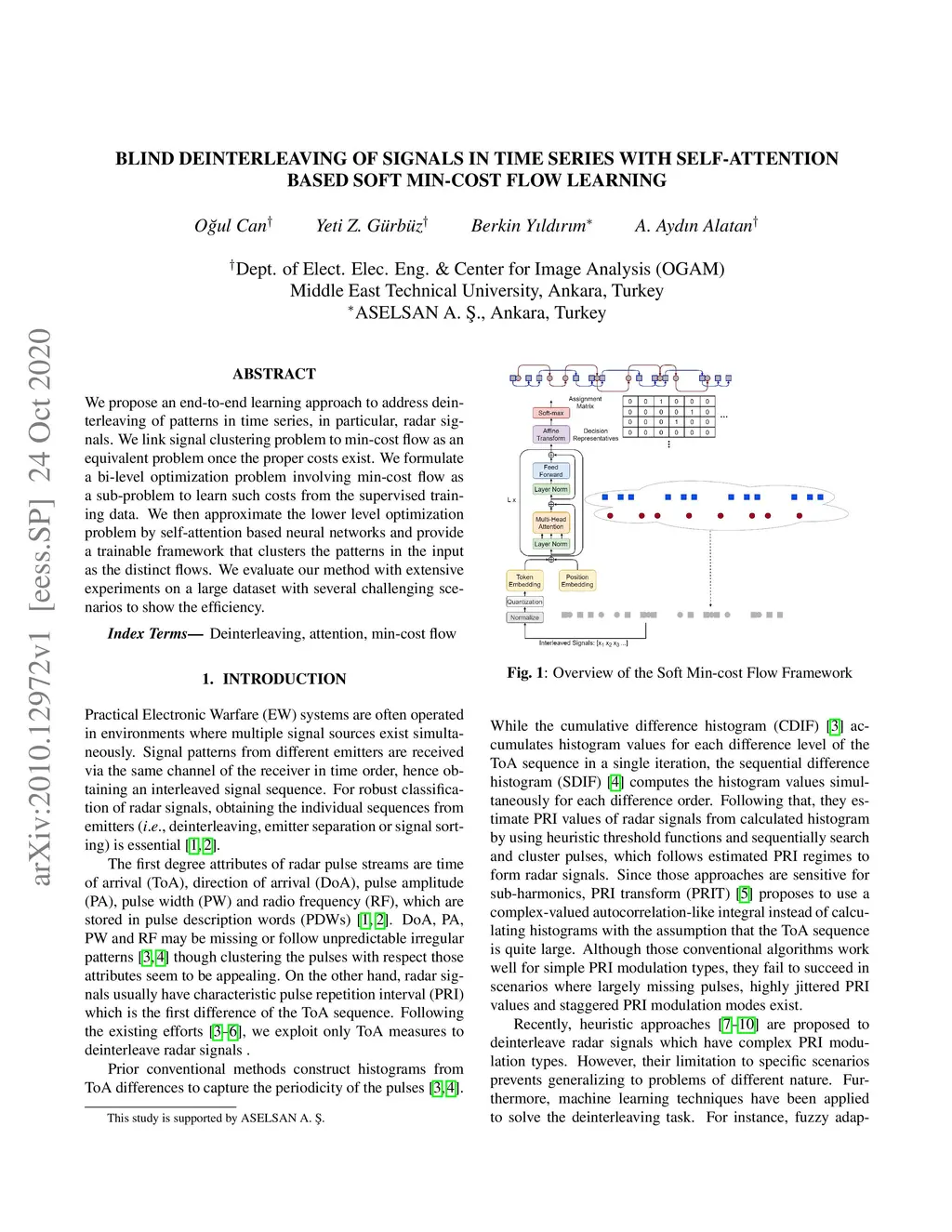 We propose an end-to-end learning approach to address deinterleaving of patterns in time series, in particular, radar signals. We link signal clustering problem to min-cost flow as an equivalent problem once the proper costs exist. We formulate a bi-level optimization problem involving min-cost flow as a sub-problem to learn such costs from the supervised training data. We then approximate the lower level optimization problem by self-attention based neural networks and provide a trainable framework that clusters the patterns in the input as the distinct flows. We evaluate our method with extensive experiments on a large dataset with several challenging scenarios to show the efficiency.