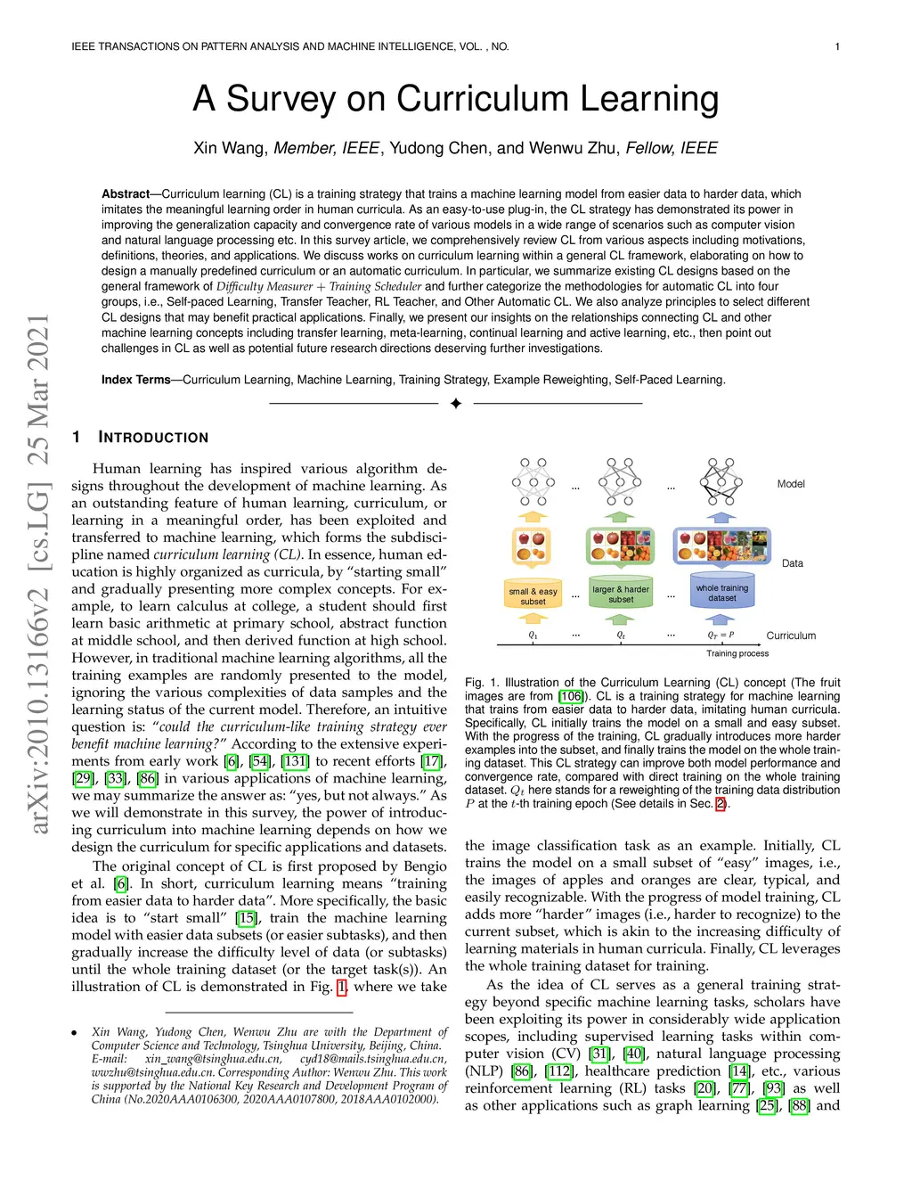 Curriculum learning (CL) is a training strategy that trains a machine learning model from easier data to harder data, which imitates the meaningful learning order in human curricula. As an easy-to-use plug-in, the CL strategy has demonstrated its power in improving the generalization capacity and convergence rate of various models in a wide range of scenarios such as computer vision and natural language processing etc. In this survey article, we comprehensively review CL from various aspects including motivations, definitions, theories, and applications. We discuss works on curriculum learning within a general CL framework, elaborating on how to design a manually predefined curriculum or an automatic curriculum. In particular, we summarize existing CL designs based on the general framework of Difficulty Measurer+Training Scheduler and further categorize the methodologies for automatic CL into four groups, i.e., Self-paced Learning, Transfer Teacher, RL Teacher, and Other Automatic CL. We also analyze principles to select different CL designs that may benefit practical applications. Finally, we present our insights on the relationships connecting CL and other machine learning concepts including transfer learning, meta-learning, continual learning and active learning, etc., then point out challenges in CL as well as potential future research directions deserving further investigations.