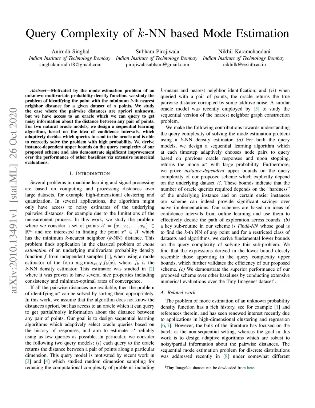 Motivated by the mode estimation problem of an unknown multivariate probability density function, we study the problem of identifying the point with the minimum k-th nearest neighbor distance for a given dataset of n points. We study the case where the pairwise distances are apriori unknown, but we have access to an oracle which we can query to get noisy information about the distance between any pair of points. For two natural oracle models, we design a sequential learning algorithm, based on the idea of confidence intervals, which adaptively decides which queries to send to the oracle and is able to correctly solve the problem with high probability. We derive instance-dependent upper bounds on the query complexity of our proposed scheme and also demonstrate significant improvement over the performance of other baselines via extensive numerical evaluations.