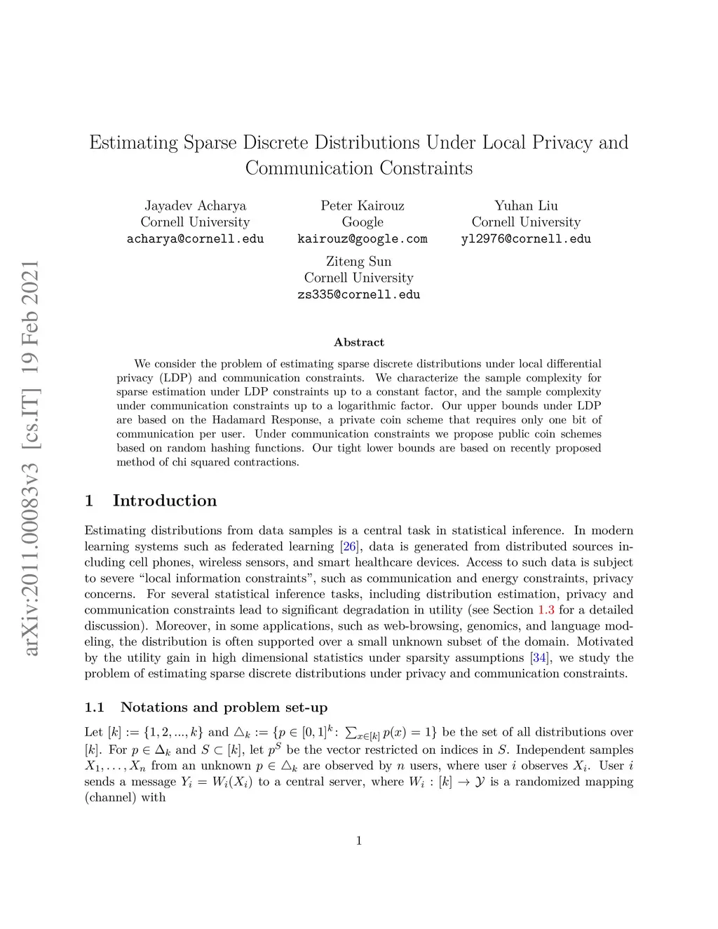 We consider the problem of estimating sparse discrete distributions under local differential privacy (LDP) and communication constraints. We characterize the sample complexity for sparse estimation under LDP constraints up to a constant factor and the sample complexity under communication constraints up to a logarithmic factor. Our upper bounds under LDP are based on the Hadamard Response, a private coin scheme that requires only one bit of communication per user. Under communication constraints, we propose public coin schemes based on random hashing functions. Our tight lower bounds are based on the recently proposed method of chi squared contractions.