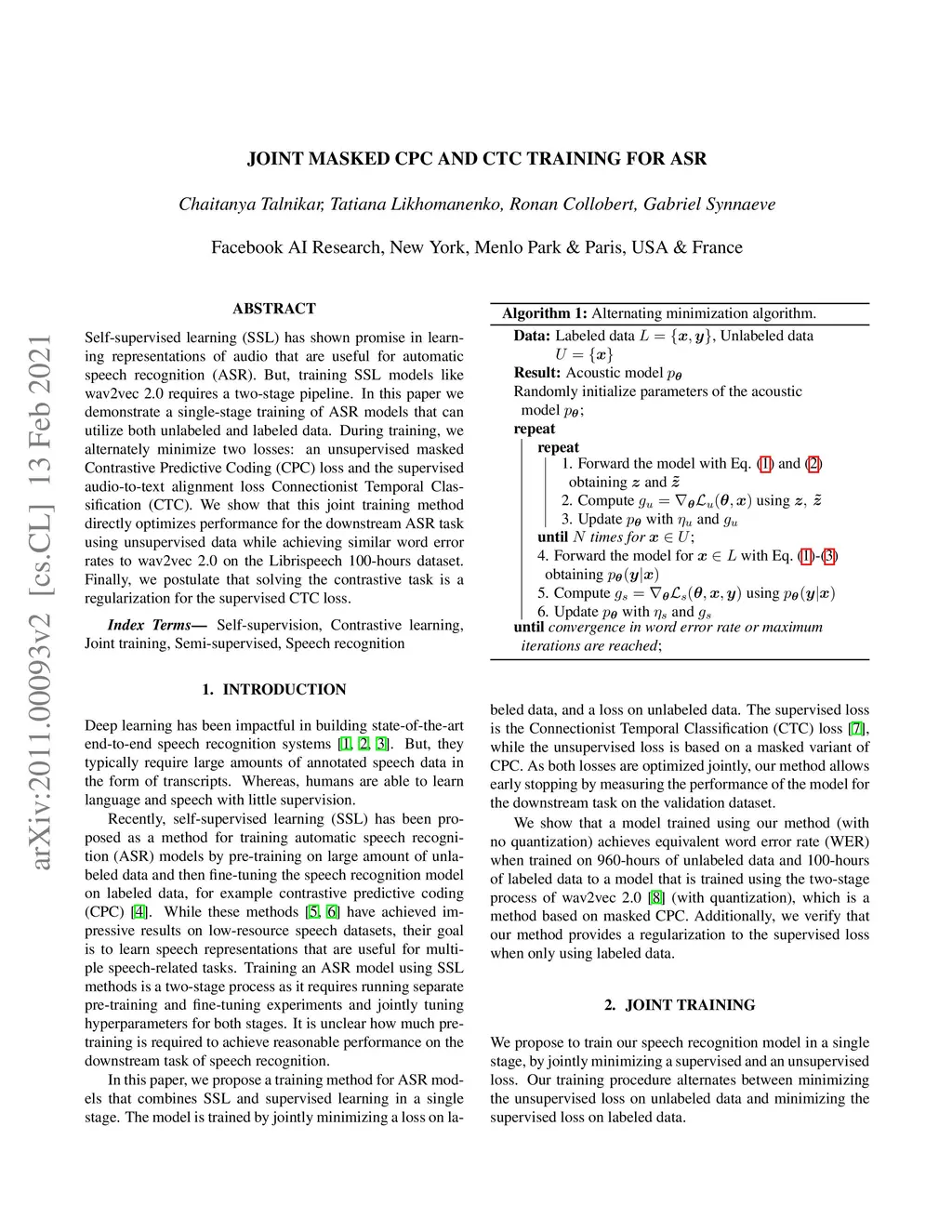 Self-supervised learning (SSL) has shown promise in learning representations of audio that are useful for automatic speech recognition (ASR). But, training SSL models like wav2vec~2.0 requires a two-stage pipeline. In this paper we demonstrate a single-stage training of ASR models that can utilize both unlabeled and labeled data. During training, we alternately minimize two losses: an unsupervised masked Contrastive Predictive Coding (CPC) loss and the supervised audio-to-text alignment loss Connectionist Temporal Classification (CTC). We show that this joint training method directly optimizes performance for the downstream ASR task using unsupervised data while achieving similar word error rates to wav2vec~2.0 on the Librispeech 100-hour dataset. Finally, we postulate that solving the contrastive task is a regularization for the supervised CTC loss.