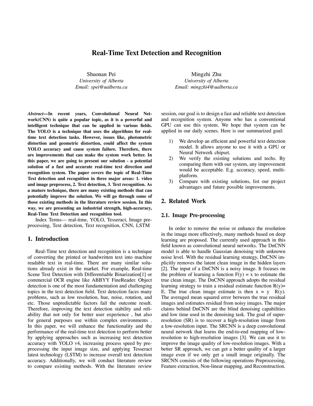 Inrecentyears,ConvolutionalNeuralNet-work(CNN) is quite a popular topic, as it is a powerful andintelligent technique that can be applied in various fields.The YOLO is a technique that uses the algorithms for real-time text detection tasks. However, issues like, photometricdistortion and geometric distortion, could affect the systemYOLO accuracy and cause system failure. Therefore, thereare improvements that can make the system work better. Inthis paper, we are going to present our solution - a potentialsolution of a fast and accurate real-time text direction andrecognition system. The paper covers the topic of Real-TimeText detection and recognition in three major areas: 1. videoand image preprocess, 2. Text detection, 3. Text recognition. Asa mature technique, there are many existing methods that canpotentially improve the solution. We will go through some ofthose existing methods in the literature review session. In thisway, we are presenting an industrial strength, high-accuracy,Real-Time Text Detection and recognition tool.