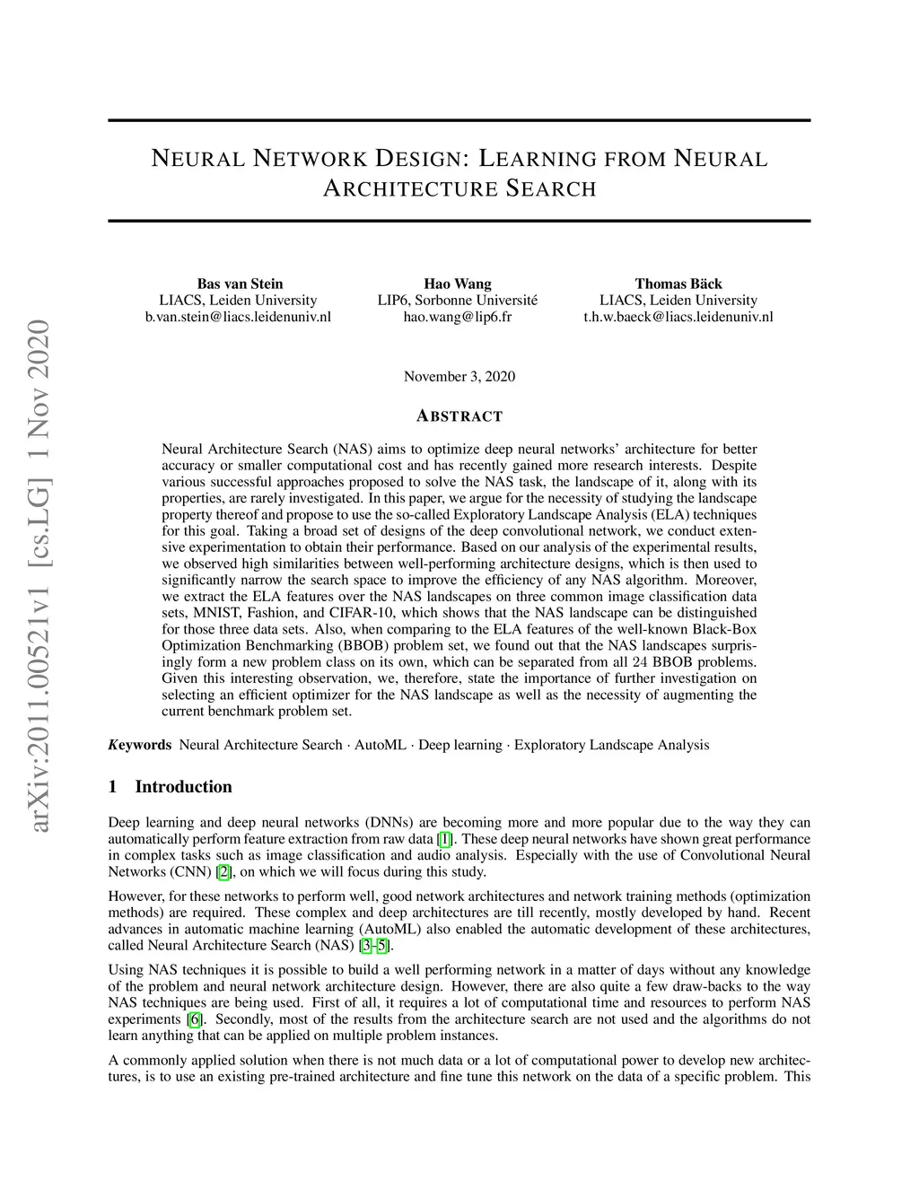 Neural Architecture Search (NAS) aims to optimize deep neural networks' architecture for better accuracy or smaller computational cost and has recently gained more research interests. Despite various successful approaches proposed to solve the NAS task, the landscape of it, along with its properties, are rarely investigated. In this paper, we argue for the necessity of studying the landscape property thereof and propose to use the so-called Exploratory Landscape Analysis (ELA) techniques for this goal. Taking a broad set of designs of the deep convolutional network, we conduct extensive experimentation to obtain their performance. Based on our analysis of the experimental results, we observed high similarities between well-performing architecture designs, which is then used to significantly narrow the search space to improve the efficiency of any NAS algorithm. Moreover, we extract the ELA features over the NAS landscapes on three common image classification data sets, MNIST, Fashion, and CIFAR-10, which shows that the NAS landscape can be distinguished for those three data sets. Also, when comparing to the ELA features of the well-known Black-Box Optimization Benchmarking (BBOB) problem set, we found out that the NAS landscapes surprisingly form a new problem class on its own, which can be separated from all BBOB problems. Given this interesting observation, we, therefore, state the importance of further investigation on selecting an efficient optimizer for the NAS landscape as well as the necessity of augmenting the current benchmark problem set.