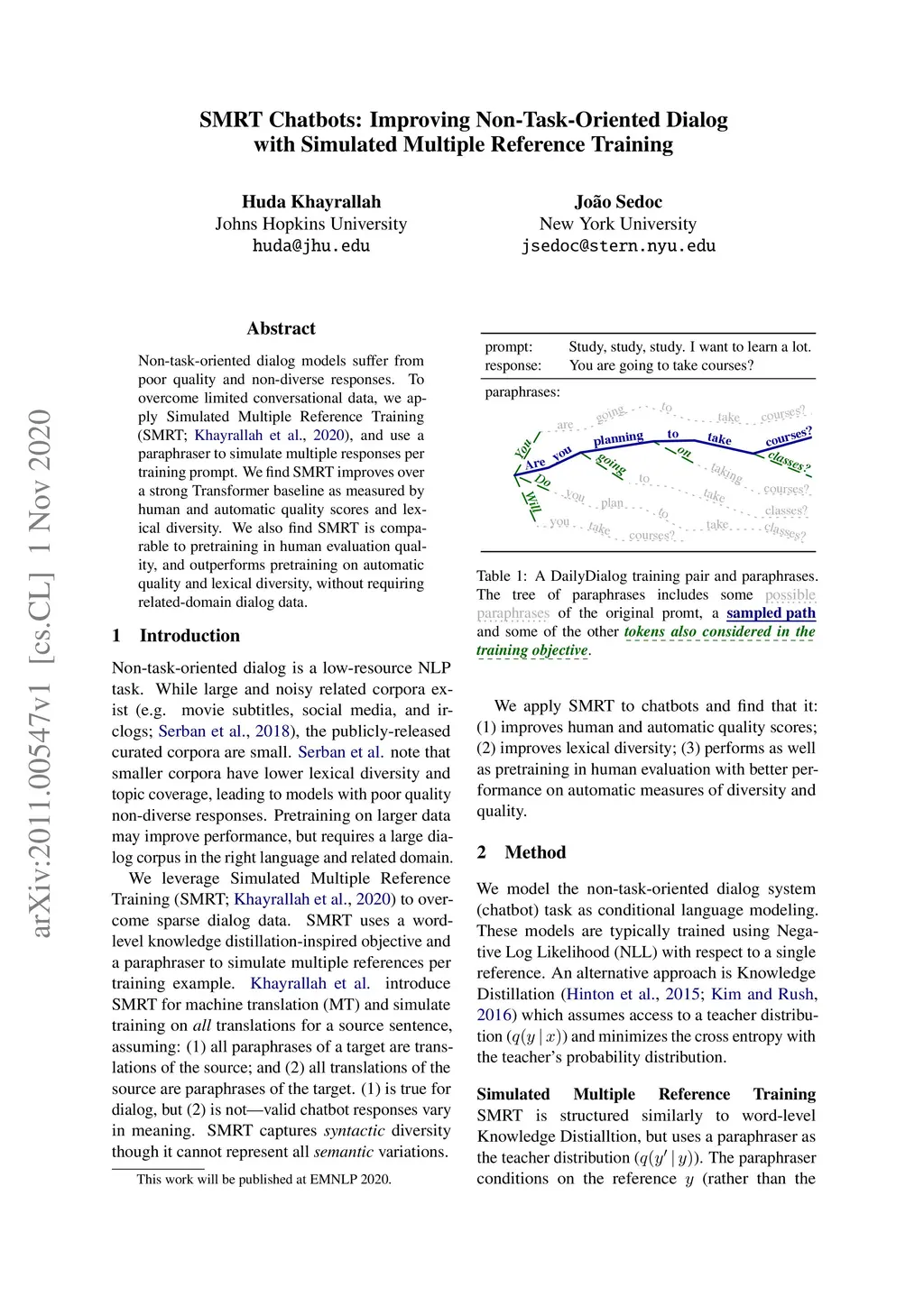 Non-task-oriented dialog models suffer from poor quality and non-diverse responses. To overcome limited conversational data, we apply Simulated Multiple Reference Training (SMRT; Khayrallah et al., 2020), and use a paraphraser to simulate multiple responses per training prompt. We find SMRT improves over a strong Transformer baseline as measured by human and automatic quality scores and lexical diversity. We also find SMRT is comparable to pretraining in human evaluation quality, and outperforms pretraining on automatic quality and lexical diversity, without requiring related-domain dialog data.