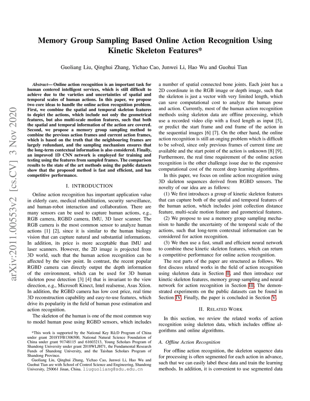 Memory Group Sampling Based Online Action Recognition Using Kinetic