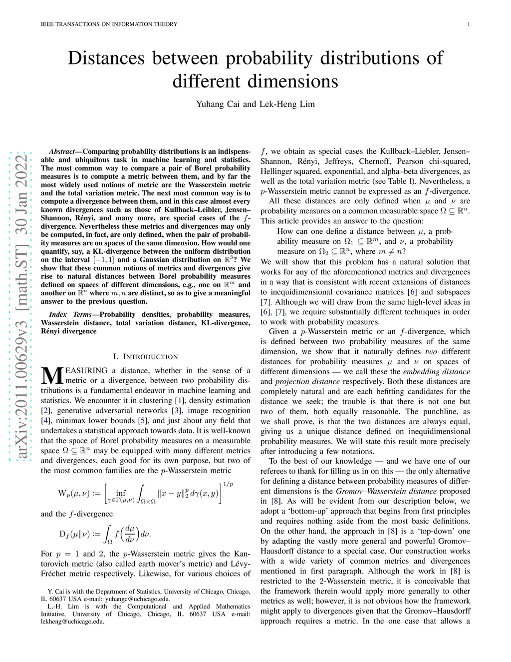 Comparing probability distributions is an indispensable and ubiquitous task in machine learning and statistics. The most common way to compare a pair of Borel probability measures is to compute a metric between them, and by far the most widely used notions of metric are the Wasserstein metric and the total variation metric. The next most common way is to compute a divergence between them, and in this case almost every known divergences such as those of Kullback--Leibler, Jensen--Shannon, R\ényi, and many more, are special cases of the -divergence. Nevertheless these metrics and divergences may only be computed, in fact, are only defined, when the pair of probability measures are on spaces of the same dimension. How would one quantify, say, a KL-divergence between the uniform distribution on the interval and a Gaussian distribution on ? We show that these common notions of metrics and divergences give rise to natural distances between Borel probability measures defined on spaces of different dimensions, e.g., one on and another on where are distinct, so as to give a meaningful answer to the previous question.