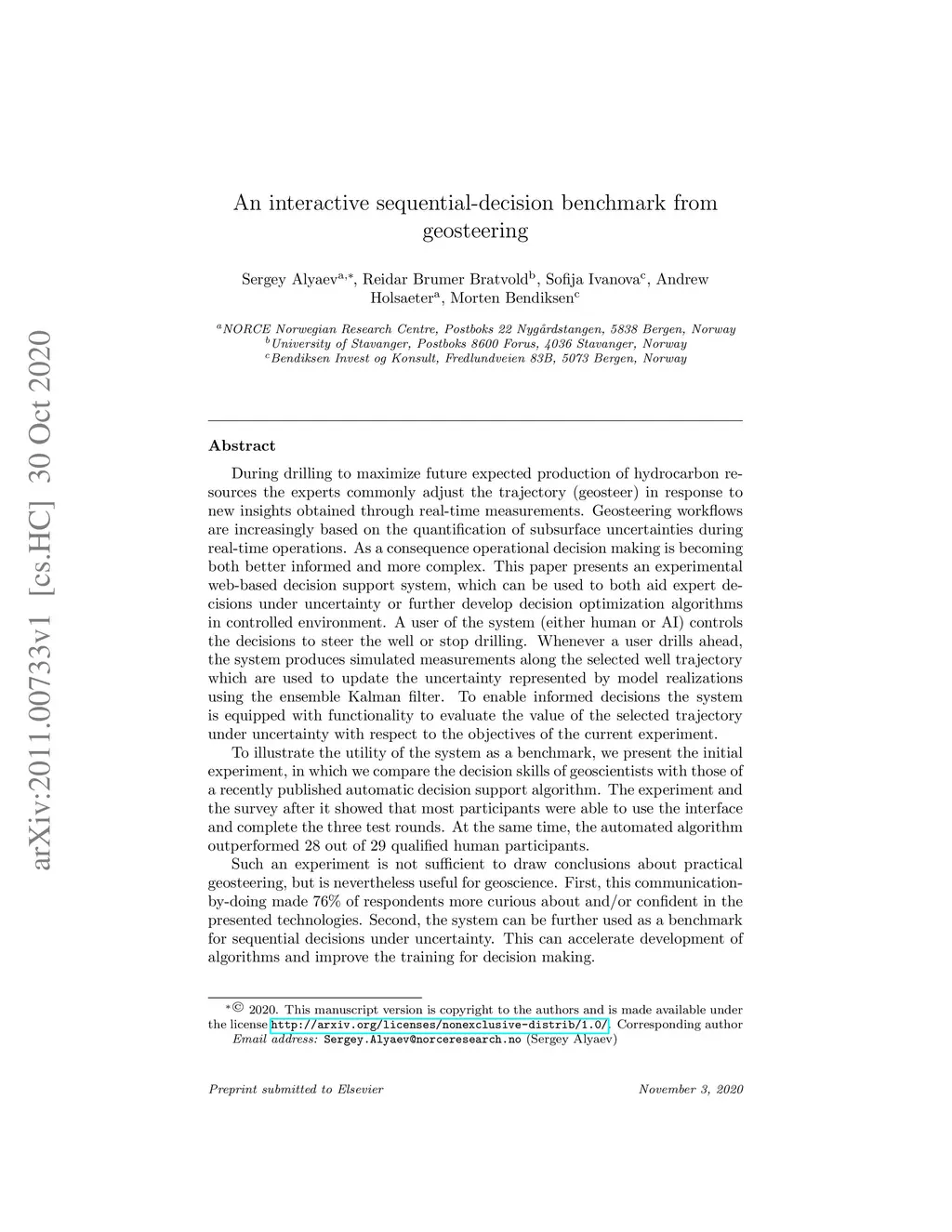 Geosteering workflows are increasingly based on the quantification of subsurface uncertainties during real-time operations. As a consequence operational decision making is becoming both better informed and more complex. This paper presents an experimental web-based decision support system, which can be used to both aid expert decisions under uncertainty or further develop decision optimization algorithms in controlled environment. A user of the system (either human or AI) controls the decisions to steer the well or stop drilling. Whenever a user drills ahead, the system produces simulated measurements along the selected well trajectory which are used to update the uncertainty represented by model realizations using the ensemble Kalman filter. To enable informed decisions the system is equipped with functionality to evaluate the value of the selected trajectory under uncertainty with respect to the objectives of the current experiment. To illustrate the utility of the system as a benchmark, we present the initial experiment, in which we compare the decision skills of geoscientists with those of a recently published automatic decision support algorithm. The experiment and the survey after it showed that most participants were able to use the interface and complete the three test rounds. At the same time, the automated algorithm outperformed 28 out of 29 qualified human participants. Such an experiment is not sufficient to draw conclusions about practical geosteering, but is nevertheless useful for geoscience. First, this communication-by-doing made 76% of respondents more curious about and/or confident in the presented technologies. Second, the system can be further used as a benchmark for sequential decisions under uncertainty. This can accelerate development of algorithms and improve the training for decision making.