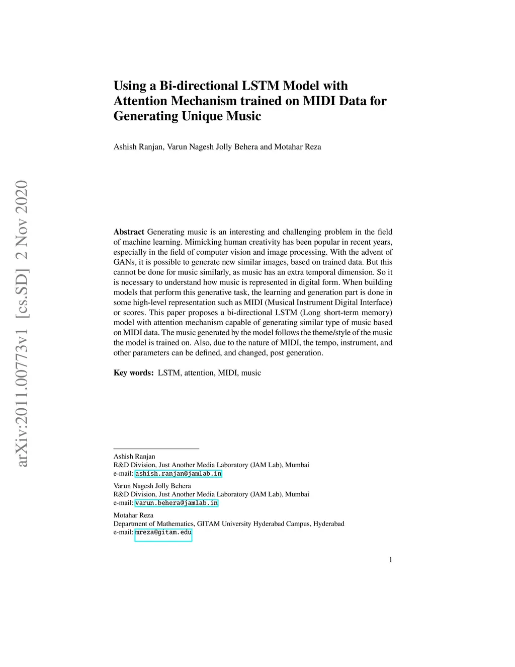 Generating music is an interesting and challenging problem in the field of machine learning. Mimicking human creativity has been popular in recent years, especially in the field of computer vision and image processing. With the advent of GANs, it is possible to generate new similar images, based on trained data. But this cannot be done for music similarly, as music has an extra temporal dimension. So it is necessary to understand how music is represented in digital form. When building models that perform this generative task, the learning and generation part is done in some high-level representation such as MIDI (Musical Instrument Digital Interface) or scores. This paper proposes a bi-directional LSTM (Long short-term memory) model with attention mechanism capable of generating similar type of music based on MIDI data. The music generated by the model follows the theme/style of the music the model is trained on. Also, due to the nature of MIDI, the tempo, instrument, and other parameters can be defined, and changed, post generation.