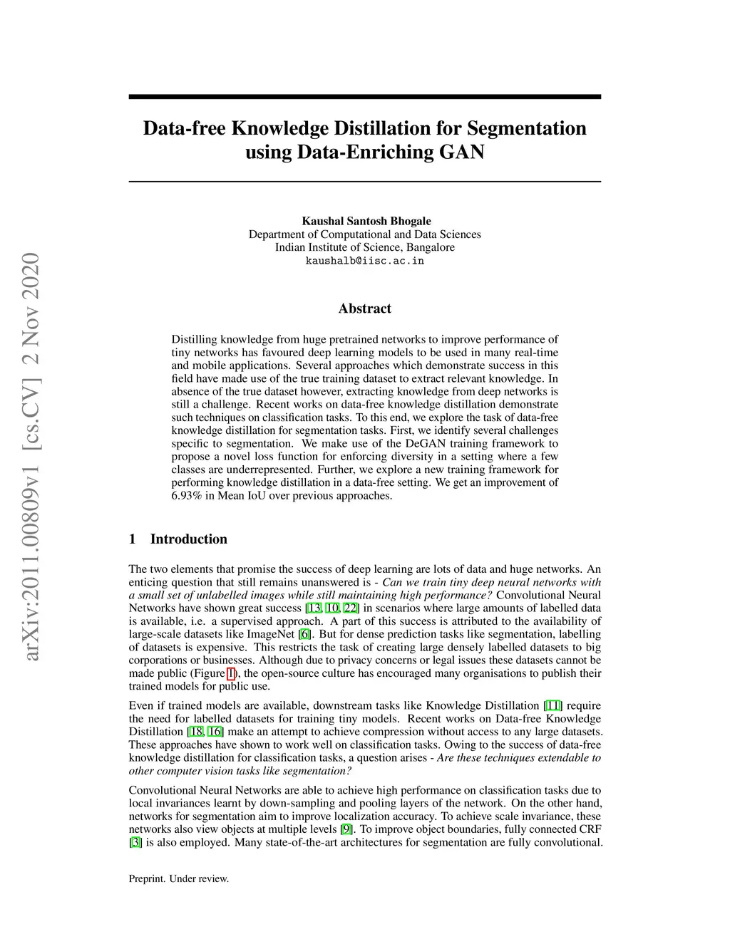 Distilling knowledge from huge pre-trained networks to improve the performance of tiny networks has favored deep learning models to be used in many real-time and mobile applications. Several approaches that demonstrate success in this field have made use of the true training dataset to extract relevant knowledge. In absence of the True dataset, however, extracting knowledge from deep networks is still a challenge. Recent works on data-free knowledge distillation demonstrate such techniques on classification tasks. To this end, we explore the task of data-free knowledge distillation for segmentation tasks. First, we identify several challenges specific to segmentation. We make use of the DeGAN training framework to propose a novel loss function for enforcing diversity in a setting where a few classes are underrepresented. Further, we explore a new training framework for performing knowledge distillation in a data-free setting. We get an improvement of 6.93% in Mean IoU over previous approaches.