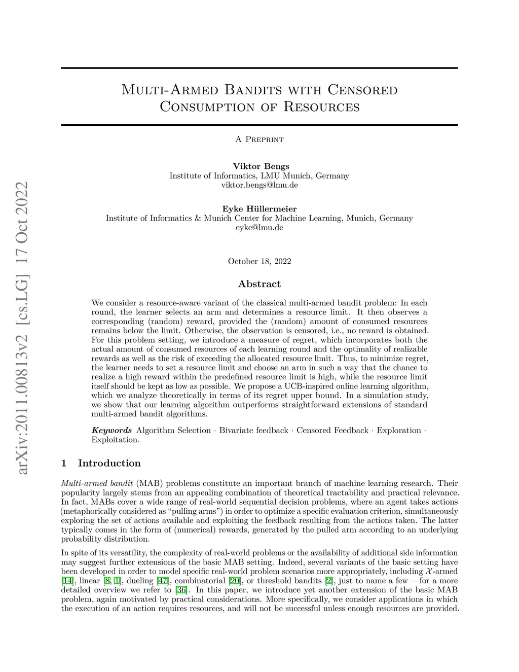We consider a resource-aware variant of the classical multi-armed bandit problem: In each round, the learner selects an arm and determines a resource limit. It then observes a corresponding (random) reward, provided the (random) amount of consumed resources remains below the limit. Otherwise, the observation is censored, i.e., no reward is obtained. For this problem setting, we introduce a measure of regret, which incorporates the actual amount of allocated resources of each learning round as well as the optimality of realizable rewards. Thus, to minimize regret, the learner needs to set a resource limit and choose an arm in such a way that the chance to realize a high reward within the predefined resource limit is high, while the resource limit itself should be kept as low as possible. We propose a UCB-inspired online learning algorithm, which we analyze theoretically in terms of its regret upper bound. In a simulation study, we show that our learning algorithm outperforms straightforward extensions of standard multi-armed bandit algorithms.
