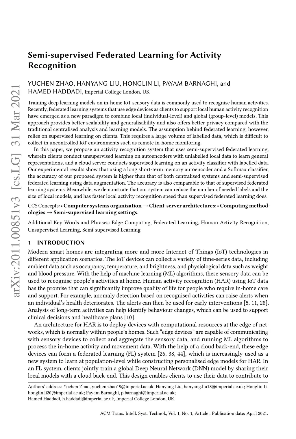 Training deep learning models on in-home IoT sensory data is commonly used to recognise human activities. Recently, federated learning systems that use edge devices as clients to support local human activity recognition have emerged as a new paradigm to combine local (individual-level) and global (group-level) models. This approach provides better scalability and generalisability and also offers better privacy compared with the traditional centralised analysis and learning models. The assumption behind federated learning, however, relies on supervised learning on clients. This requires a large volume of labelled data, which is difficult to collect in uncontrolled IoT environments such as remote in-home monitoring. In this paper, we propose an activity recognition system that uses semi-supervised federated learning, wherein clients conduct unsupervised learning on autoencoders with unlabelled local data to learn general representations, and a cloud server conducts supervised learning on an activity classifier with labelled data. Our experimental results show that using a long short-term memory autoencoder and a Softmax classifier, the accuracy of our proposed system is higher than that of both centralised systems and semi-supervised federated learning using data augmentation. The accuracy is also comparable to that of supervised federated learning systems. Meanwhile, we demonstrate that our system can reduce the number of needed labels and the size of local models, and has faster local activity recognition speed than supervised federated learning does.