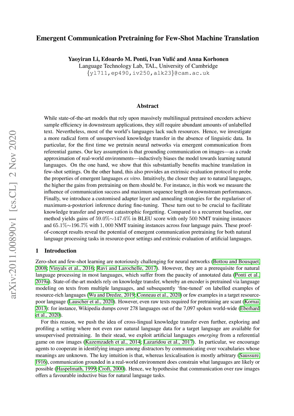 While state-of-the-art models that rely upon massively multilingual pretrained encoders achieve sample efficiency in downstream applications, they still require abundant amounts of unlabelled text. Nevertheless, most of the world's languages lack such resources. Hence, we investigate a more radical form of unsupervised knowledge transfer in the absence of linguistic data. In particular, for the first time we pretrain neural networks via emergent communication from referential games. Our key assumption is that grounding communication on images---as a crude approximation of real-world environments---inductively biases the model towards learning natural languages. On the one hand, we show that this substantially benefits machine translation in few-shot settings. On the other hand, this also provides an extrinsic evaluation protocol to probe the properties of emergent languages ex vitro. Intuitively, the closer they are to natural languages, the higher the gains from pretraining on them should be. For instance, in this work we measure the influence of communication success and maximum sequence length on downstream performances. Finally, we introduce a customised adapter layer and annealing strategies for the regulariser of maximum-a-posteriori inference during fine-tuning. These turn out to be crucial to facilitate knowledge transfer and prevent catastrophic forgetting. Compared to a recurrent baseline, our method yields gains of in BLEU score with only NMT training instances and with NMT training instances across four language pairs. These proof-of-concept results reveal the potential of emergent communication pretraining for both natural language processing tasks in resource-poor settings and extrinsic evaluation of artificial languages.