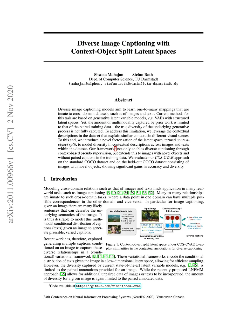 Diverse image captioning models aim to learn one-to-many mappings that are innate to cross-domain datasets, such as of images and texts. Current methods for this task are based on generative latent variable models, e.g. VAEs with structured latent spaces. Yet, the amount of multimodality captured by prior work is limited to that of the paired training data -- the true diversity of the underlying generative process is not fully captured. To address this limitation, we leverage the contextual descriptions in the dataset that explain similar contexts in different visual scenes. To this end, we introduce a novel factorization of the latent space, termed context-object split, to model diversity in contextual descriptions across images and texts within the dataset. Our framework not only enables diverse captioning through context-based pseudo supervision, but extends this to images with novel objects and without paired captions in the training data. We evaluate our COS-CVAE approach on the standard COCO dataset and on the held-out COCO dataset consisting of images with novel objects, showing significant gains in accuracy and diversity.