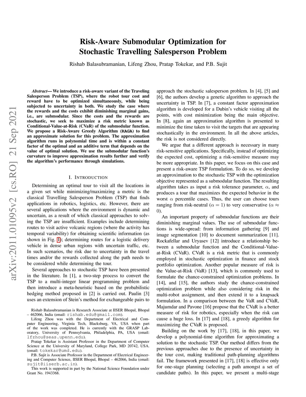 We introduce a risk-aware multi-objective Traveling Salesperson Problem (TSP) variant, where the robot tour cost and tour reward have to be optimized simultaneously. The robot obtains reward along the edges in the graph. We study the case where the rewards and the costs exhibit diminishing marginal gains, i.e., are submodular. Unlike prior work, we focus on the scenario where the costs and the rewards are uncertain and seek to maximize the Conditional-Value-at-Risk (CVaR) metric of the submodular function. We propose a risk-aware greedy algorithm (RAGA) to find a bounded-approximation algorithm. The approximation algorithm runs in polynomial time and is within a constant factor of the optimal and an additive term that depends on the optimal solution. We use the submodular function's curvature to improve approximation results further and verify the algorithm's performance through simulations.