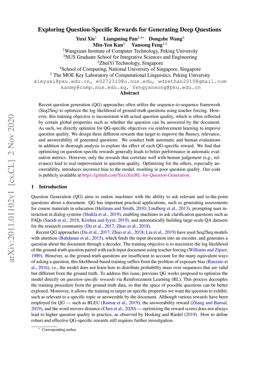 Exploring Question-Specific Rewards for Generating Deep Questions