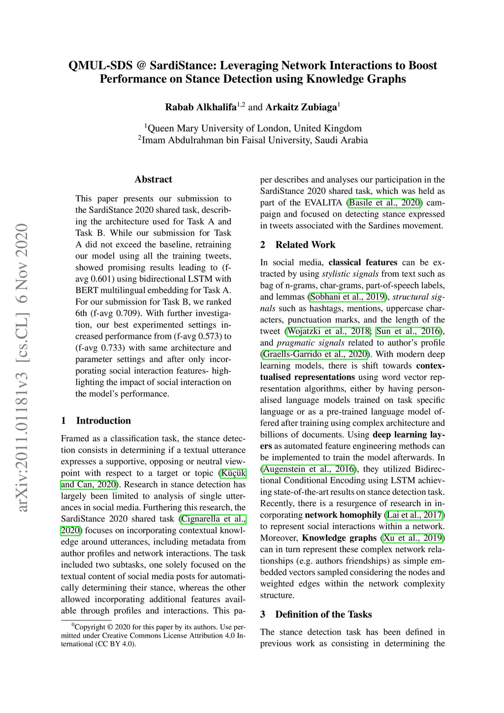 QMUL-SDS @ SardiStance: Leveraging Network Interactions to Boost