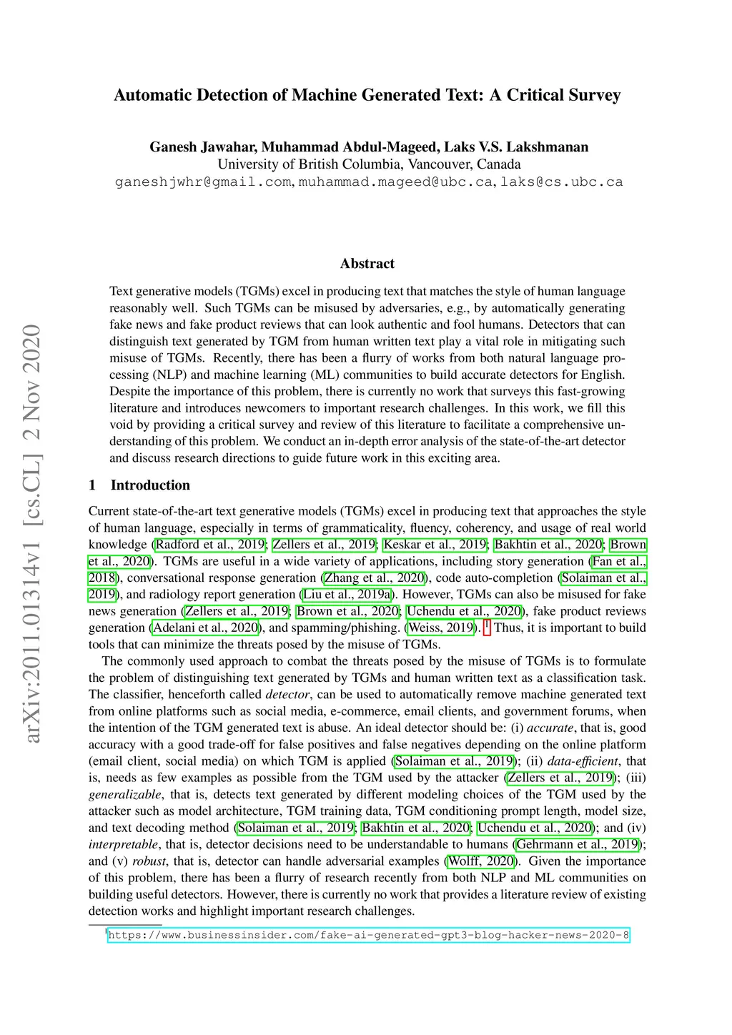Automatic Detection of Machine Generated Text: A Critical Survey