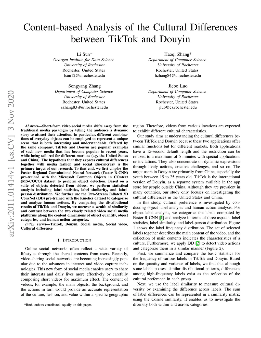 Short-form video social media shifts away from the traditional media paradigm by telling the audience a dynamic story to attract their attention. In particular, different combinations of everyday objects can be employed to represent a unique scene that is both interesting and understandable. Offered by the same company, TikTok and Douyin are popular examples of such new media that has become popular in recent years, while being tailored for different markets (e.g. the United States and China). The hypothesis that they express cultural differences together with media fashion and social idiosyncrasy is the primary target of our research. To that end, we first employ the Faster Regional Convolutional Neural Network (Faster R-CNN) pre-trained with the Microsoft Common Objects in COntext (MS-COCO) dataset to perform object detection. Based on a suite of objects detected from videos, we perform statistical analysis including label statistics, label similarity, and label-person distribution. We further use the Two-Stream Inflated 3D ConvNet (I3D) pre-trained with the Kinetics dataset to categorize and analyze human actions. By comparing the distributional results of TikTok and Douyin, we uncover a wealth of similarity and contrast between the two closely related video social media platforms along the content dimensions of object quantity, object categories, and human action categories.