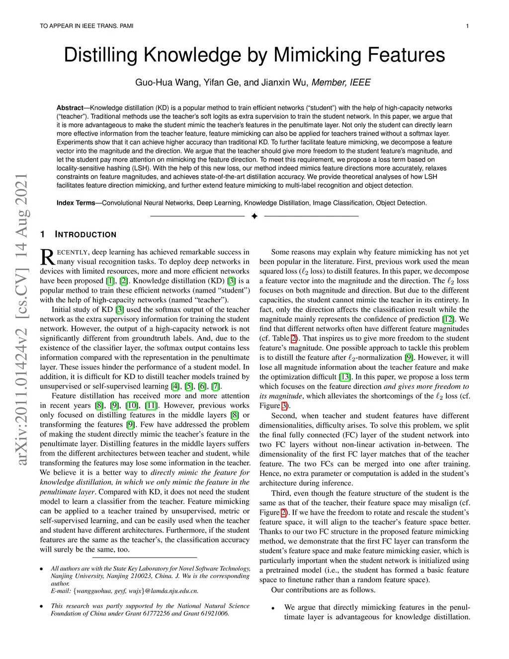 Knowledge distillation (KD) is a popular method to train efficient networks ("student") with the help of high-capacity networks ("teacher"). Traditional methods use the teacher's soft logits as extra supervision to train the student network. In this paper, we argue that it is more advantageous to make the student mimic the teacher's features in the penultimate layer. Not only the student can directly learn more effective information from the teacher feature, feature mimicking can also be applied for teachers trained without a softmax layer. Experiments show that it can achieve higher accuracy than traditional KD. To further facilitate feature mimicking, we decompose a feature vector into the magnitude and the direction. We argue that the teacher should give more freedom to the student feature's magnitude, and let the student pay more attention on mimicking the feature direction. To meet this requirement, we propose a loss term based on locality-sensitive hashing (LSH). With the help of this new loss, our method indeed mimics feature directions more accurately, relaxes constraints on feature magnitudes, and achieves state-of-the-art distillation accuracy. We provide theoretical analyses of how LSH facilitates feature direction mimicking, and further extend feature mimicking to multi-label recognition and object detection.