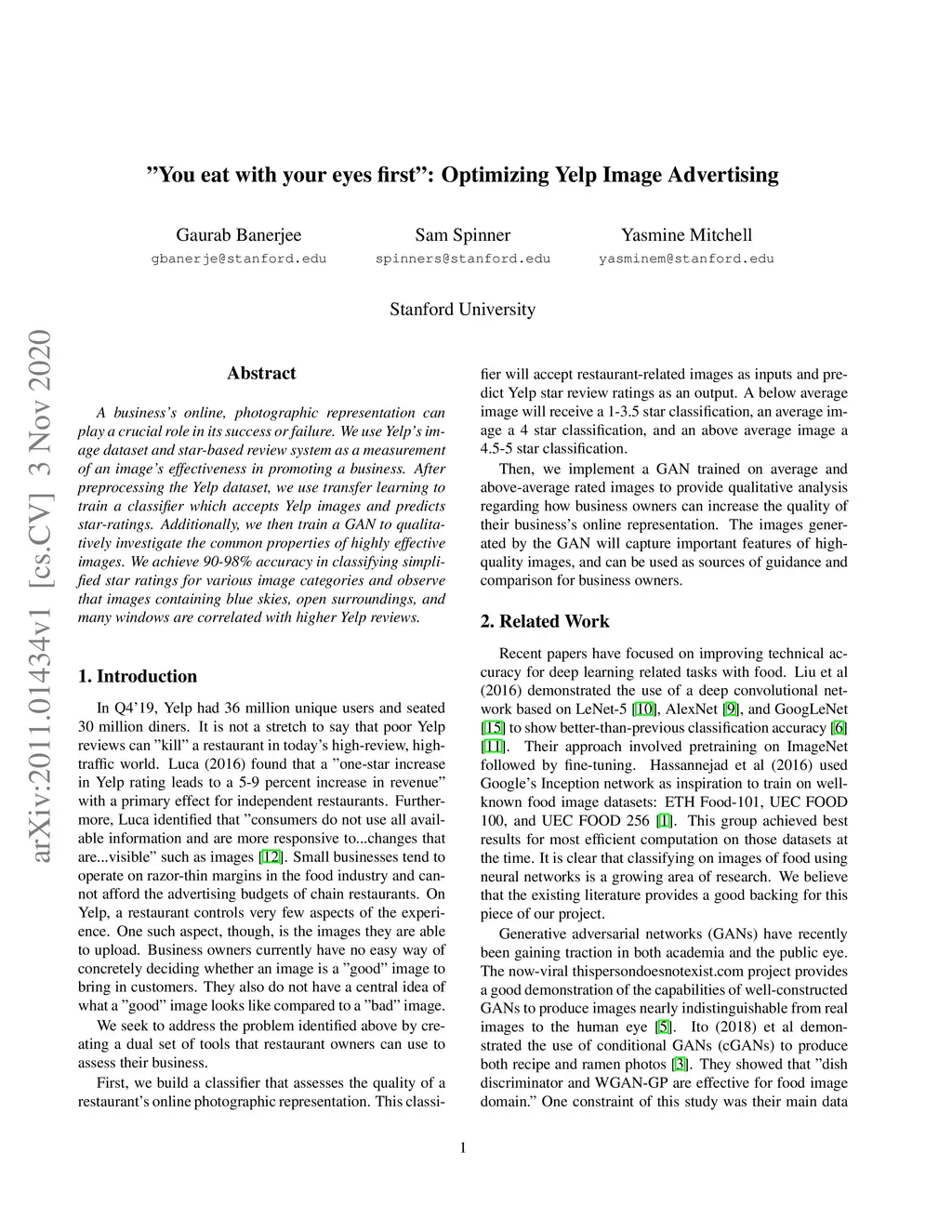 A business's online, photographic representation can play a crucial role in its success or failure. We use Yelp's image dataset and star-based review system as a measurement of an image's effectiveness in promoting a business. After preprocessing the Yelp dataset, we use transfer learning to train a classifier which accepts Yelp images and predicts star-ratings. Additionally, we then train a GAN to qualitatively investigate the common properties of highly effective images. We achieve 90-98% accuracy in classifying simplified star ratings for various image categories and observe that images containing blue skies, open surroundings, and many windows are correlated with higher Yelp reviews.