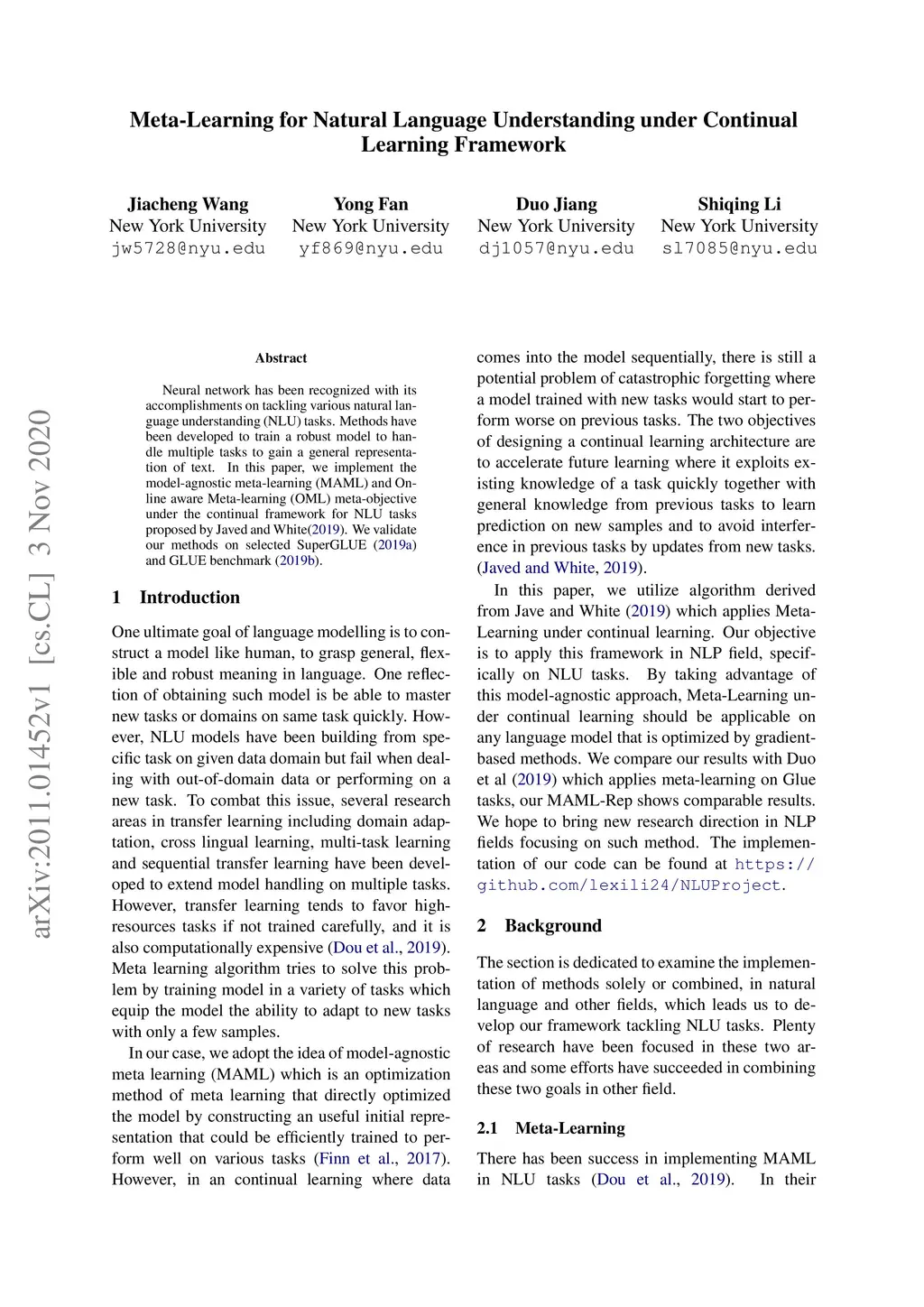 Neural network has been recognized with its accomplishments on tackling various natural language understanding (NLU) tasks. Methods have been developed to train a robust model to handle multiple tasks to gain a general representation of text. In this paper, we implement the model-agnostic meta-learning (MAML) and Online aware Meta-learning (OML) meta-objective under the continual framework for NLU tasks. We validate our methods on selected SuperGLUE and GLUE benchmark.