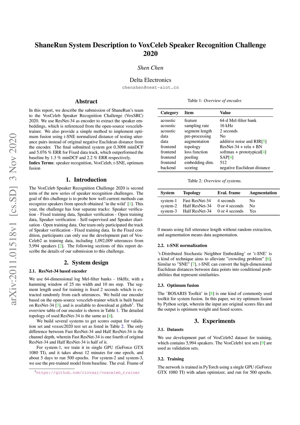 In this report, we describe the submission of ShaneRun's team to the VoxCeleb Speaker Recognition Challenge (VoxSRC) 2020. We use ResNet-34 as encoder to extract the speaker embeddings, which is referenced from the open-source voxceleb-trainer. We also provide a simple method to implement optimum fusion using t-SNE normalized distance of testing utterance pairs instead of original negative Euclidean distance from the encoder. The final submitted system got 0.3098 minDCF and 5.076 % ERR for Fixed data track, which outperformed the baseline by 1.3 % minDCF and 2.2 % ERR respectively.