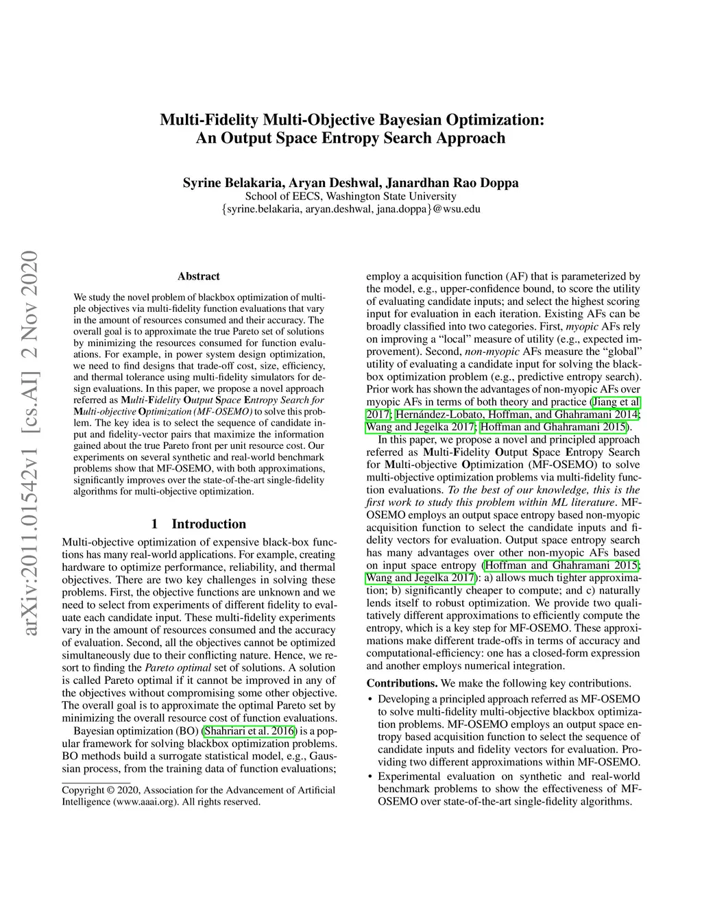 We study the novel problem of blackbox optimization of multiple objectives via multi-fidelity function evaluations that vary in the amount of resources consumed and their accuracy. The overall goal is to approximate the true Pareto set of solutions by minimizing the resources consumed for function evaluations. For example, in power system design optimization, we need to find designs that trade-off cost, size, efficiency, and thermal tolerance using multi-fidelity simulators for design evaluations. In this paper, we propose a novel approach referred as Multi-Fidelity Output Space Entropy Search for Multi-objective Optimization (MF-OSEMO) to solve this problem. The key idea is to select the sequence of candidate input and fidelity-vector pairs that maximize the information gained about the true Pareto front per unit resource cost. Our experiments on several synthetic and real-world benchmark problems show that MF-OSEMO, with both approximations, significantly improves over the state-of-the-art single-fidelity algorithms for multi-objective optimization.